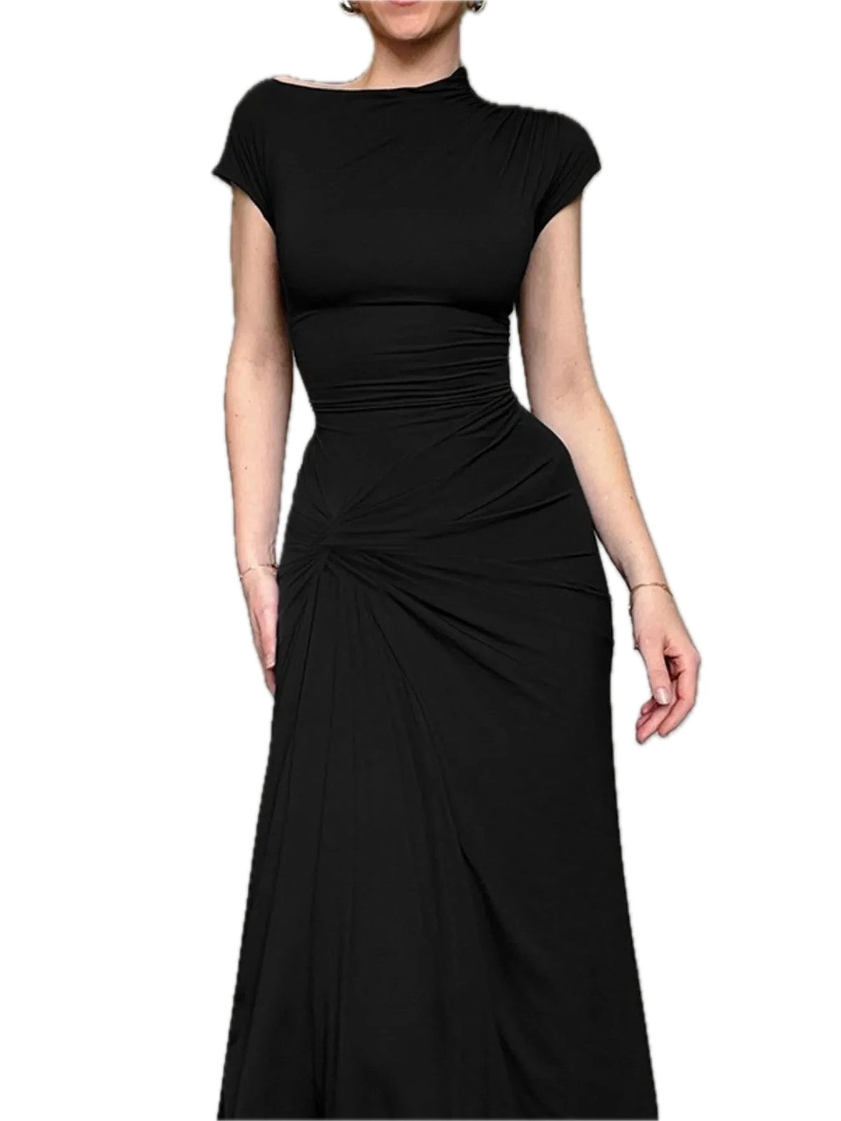 Women's Ruched Slit Cap Sleeve Maxi Dress 100% Polyester Lightweight Yet Elegant Everyday Wear for Travel and Office