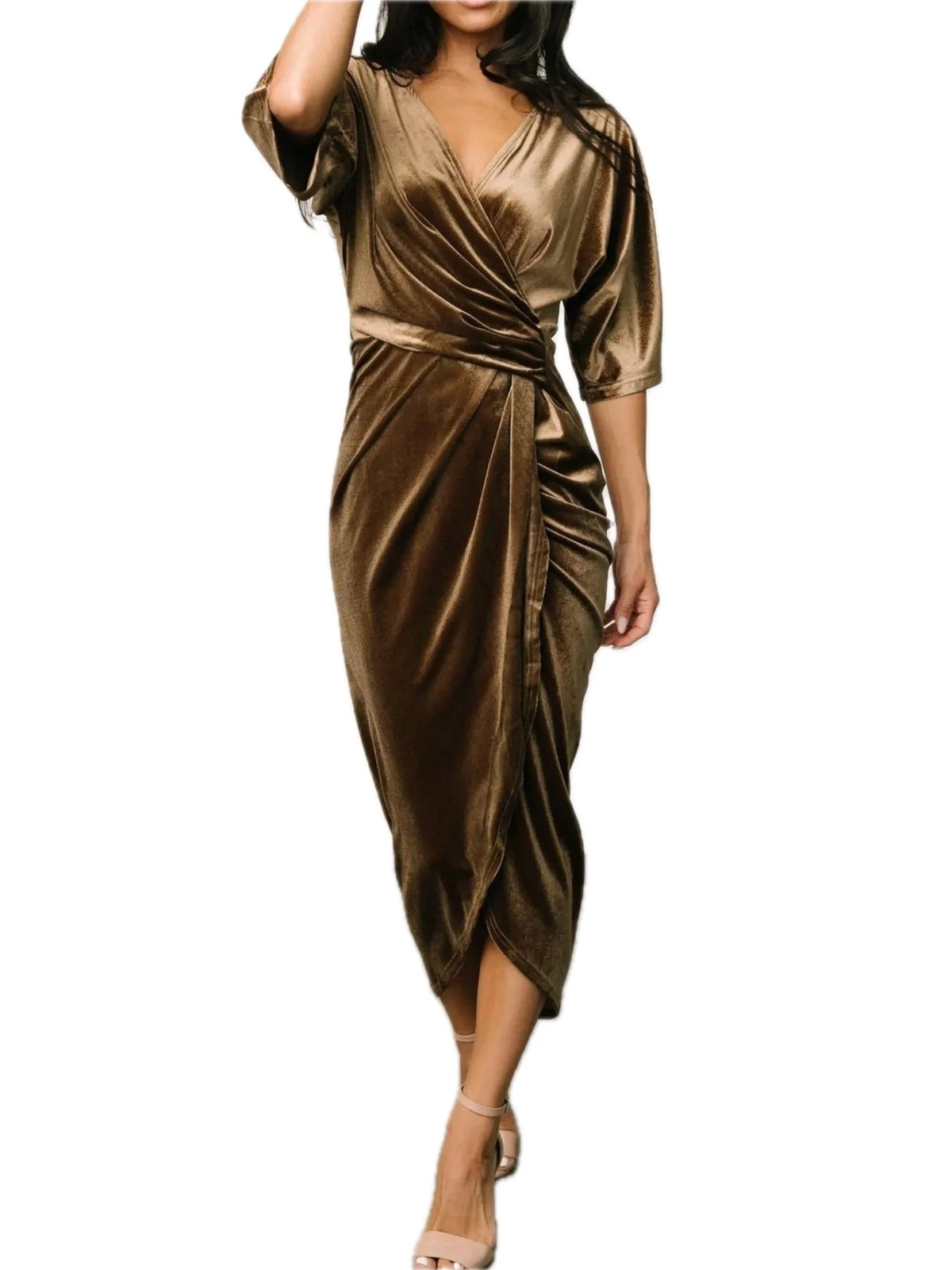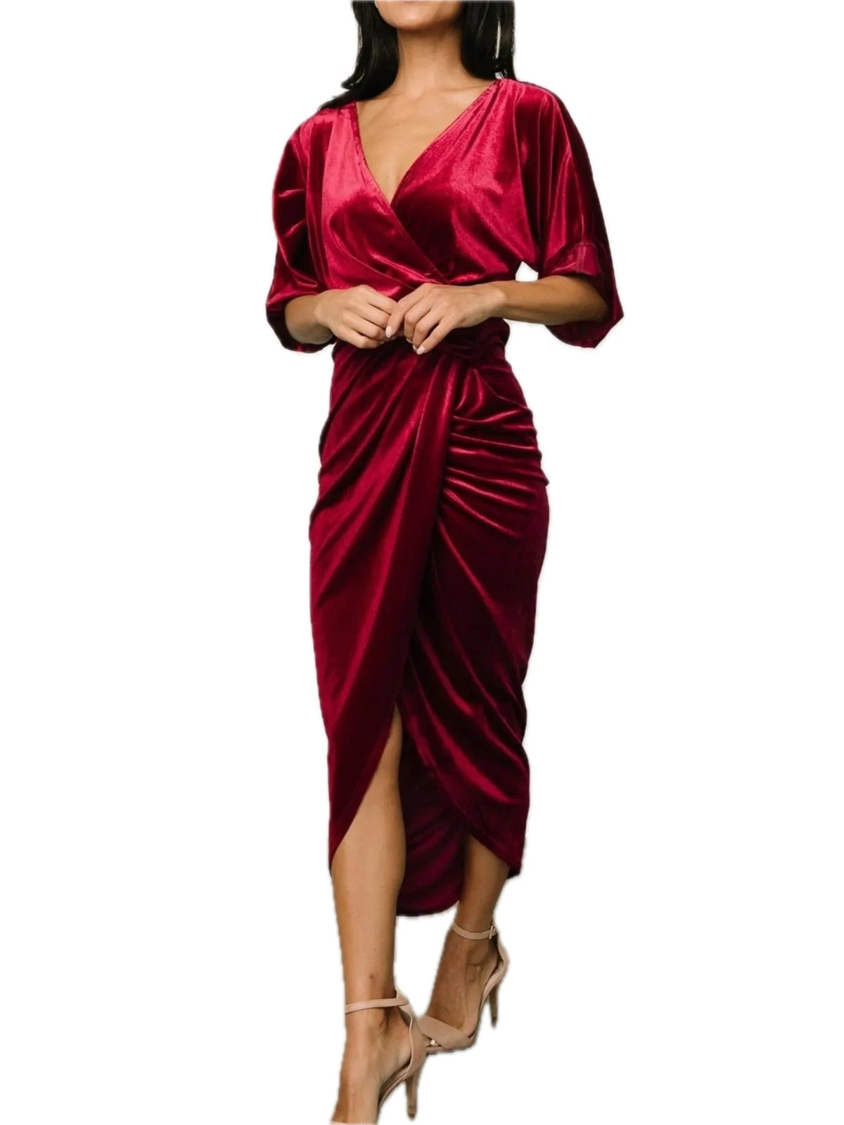 Women's Ruched Surplice Half Sleeve Dress with Slit and Stretch 95% Polyester 5% Spandex Perfect for Party Wear