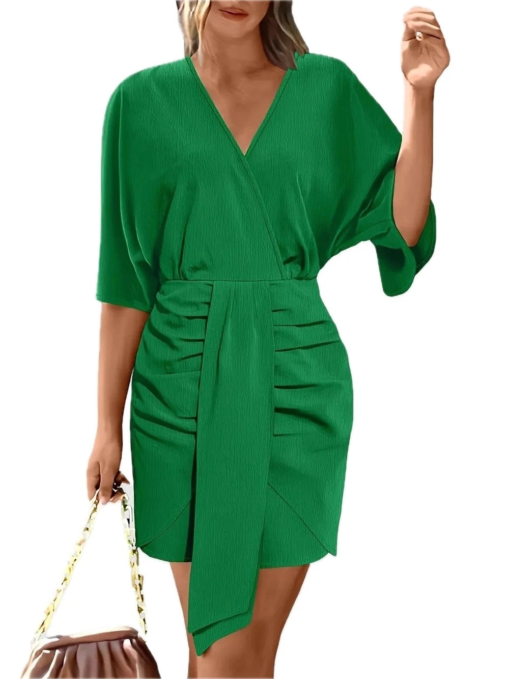 Women's Ruched Surplice Half Sleeve Mini Dress with Flowy Silhouette and Stretch Fabric 95% Polyester 5% Spandex