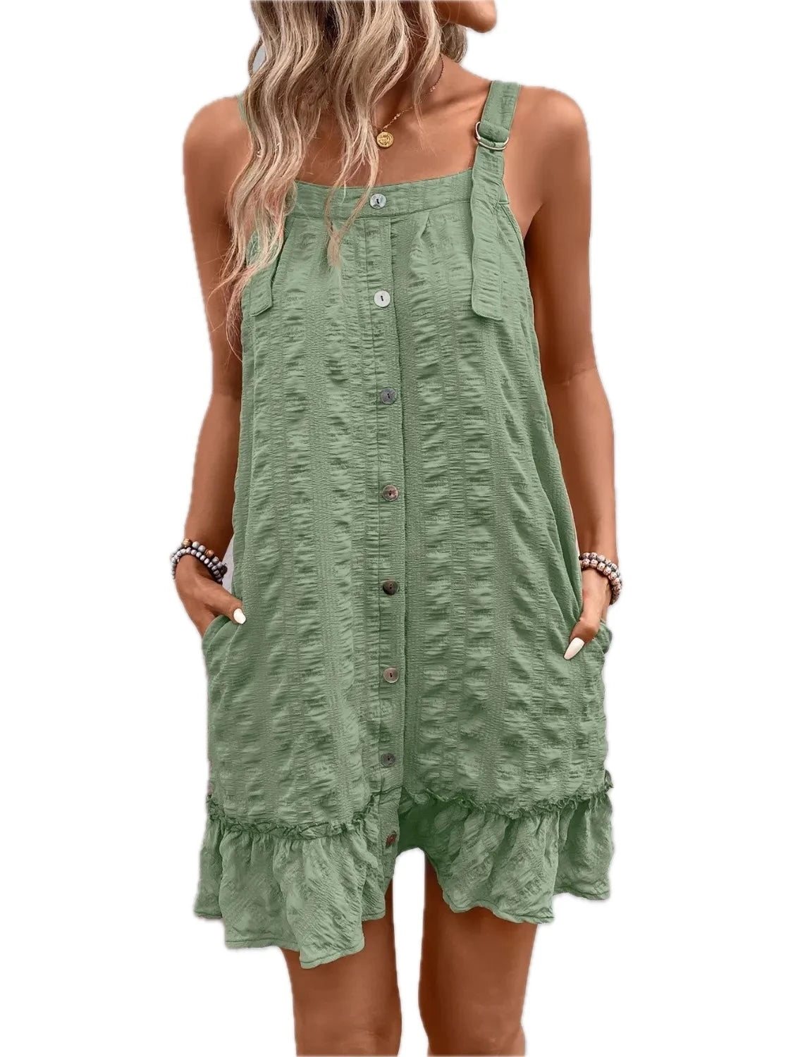 Women's Ruffled Hem Adjustable Strap Square Neck Dress Pocketed Buttoned Front 95% polyester 5% elastane Imported