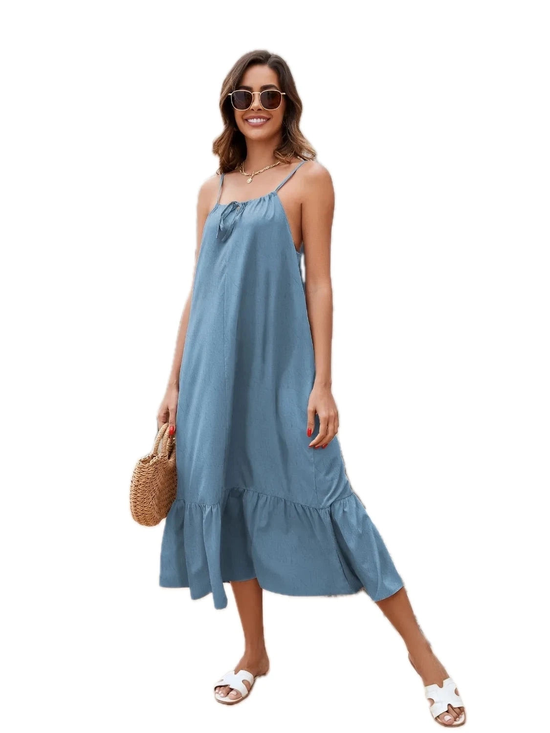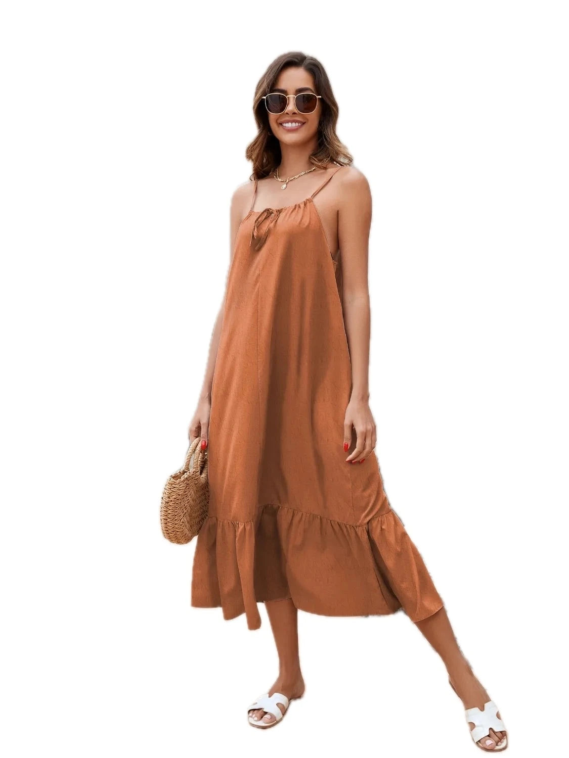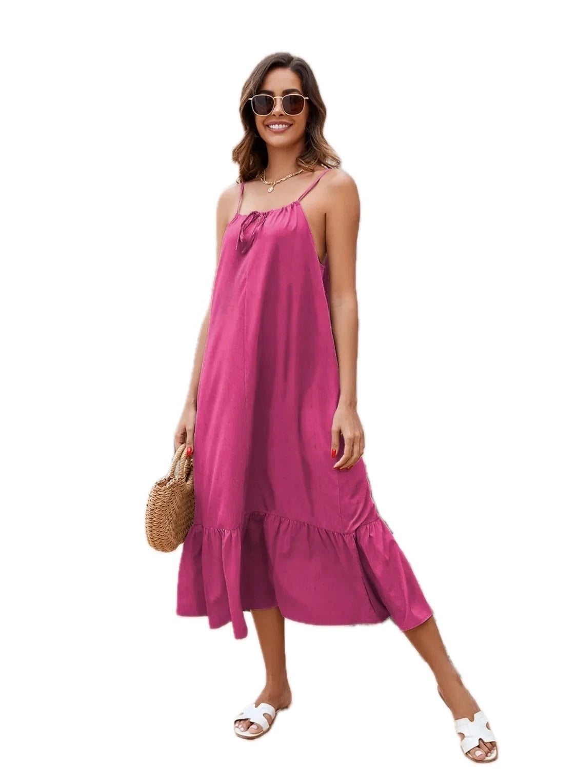 Women's Ruffled Hem Midi Cami Dress with Tie Front Lightweight Breathable 100% Cotton Fabric Comfortable Everyday Wear