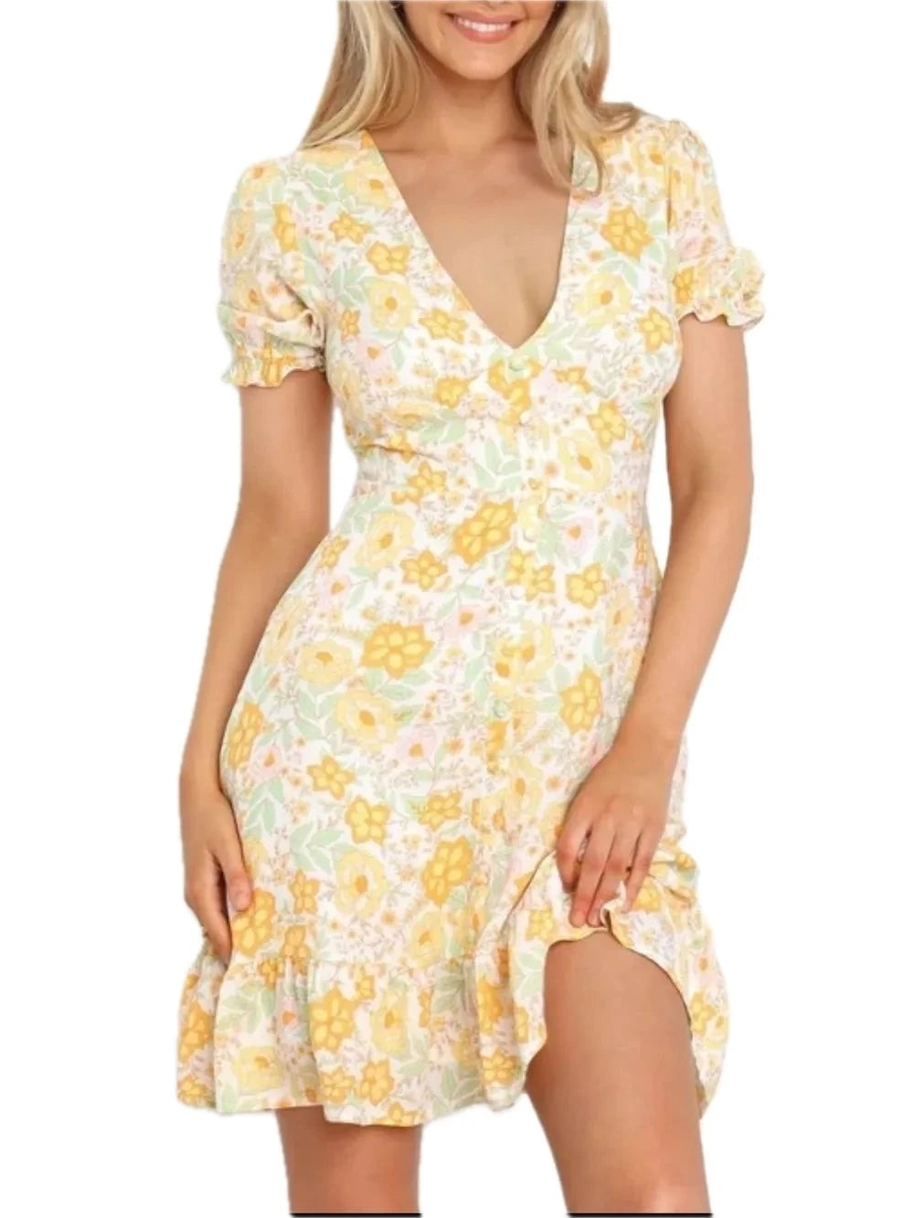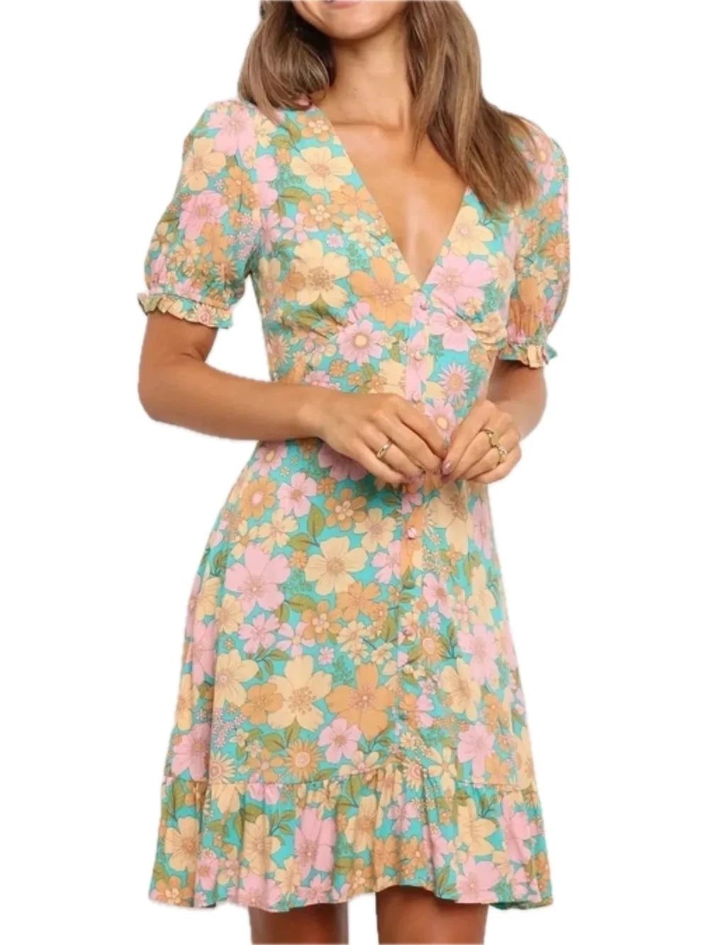 Women's Ruffled Hem Printed Short Sleeve Mini Dress with Buttoned Front and Opaque Overlay 100% Polyester Fabric
