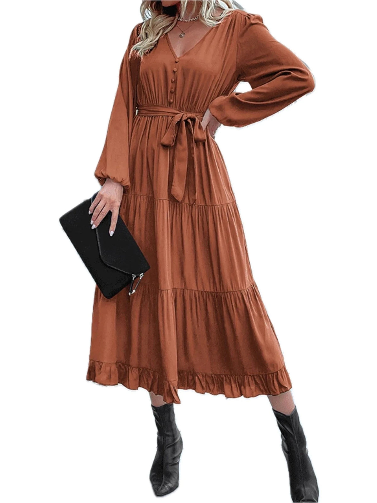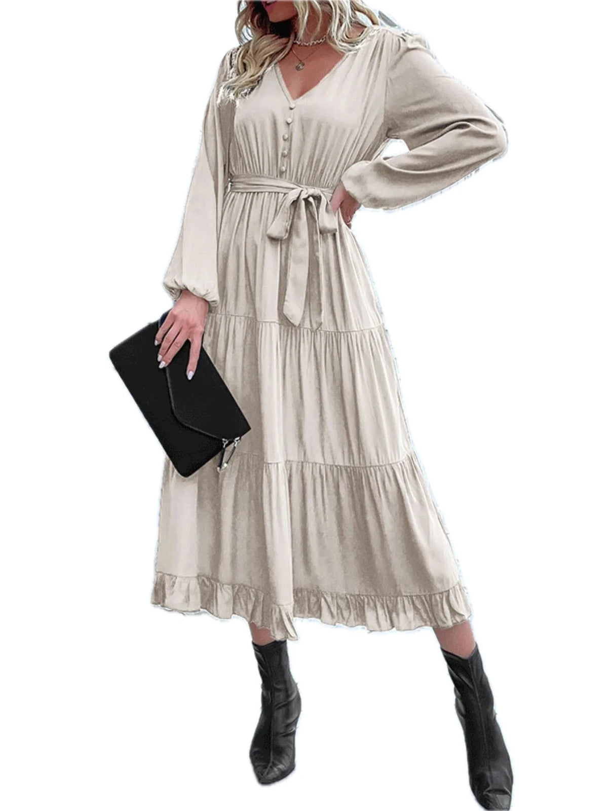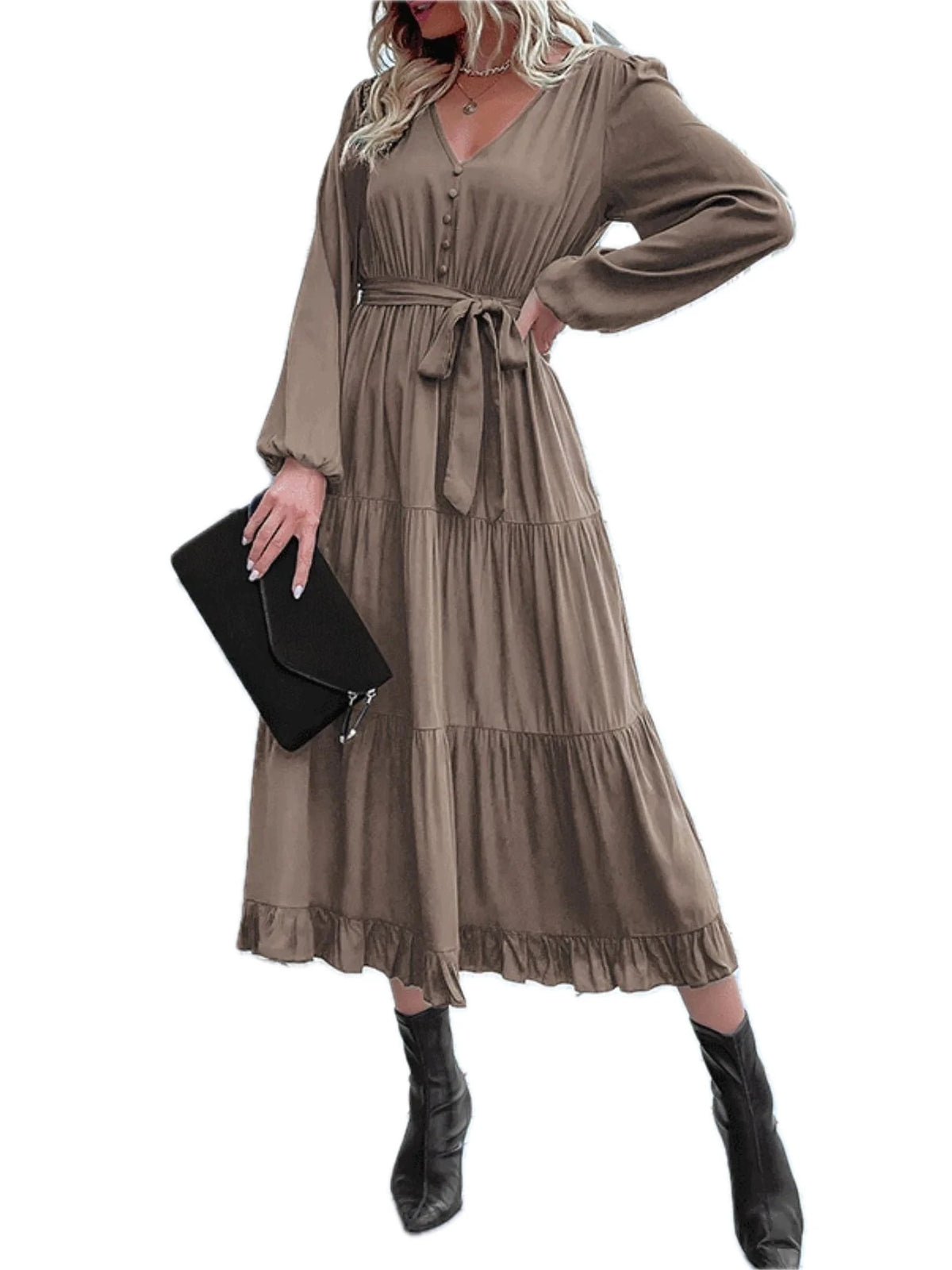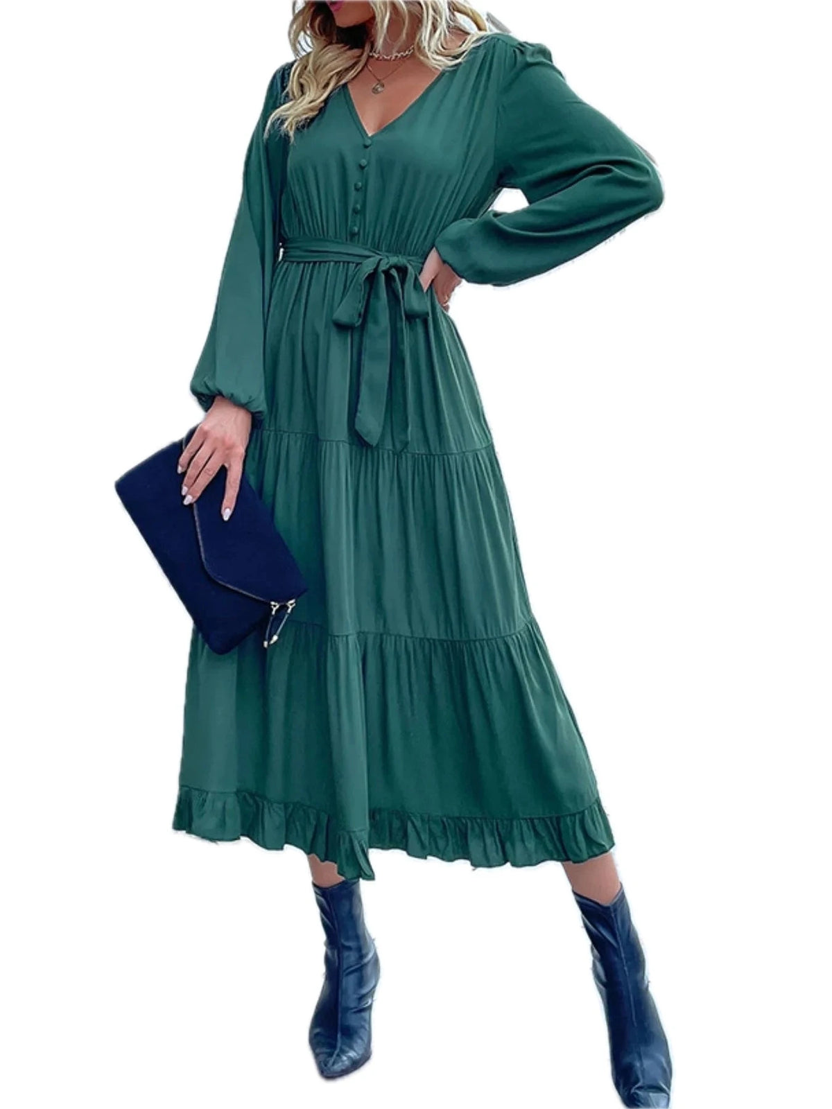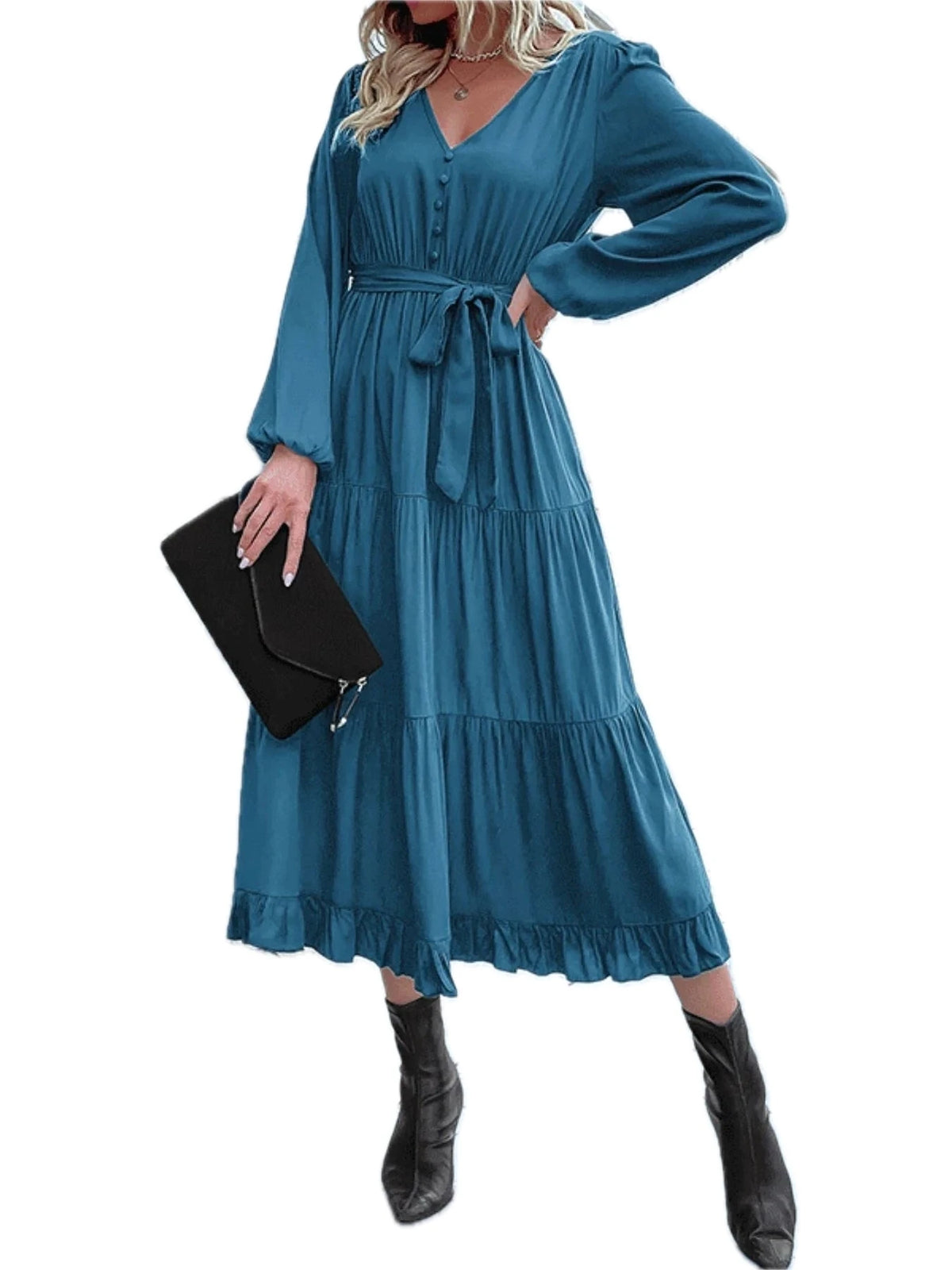 Women's Ruffled Hem V Neck Balloon Sleeve Dress with 60% viscose fabric for elegant drape and everyday comfort