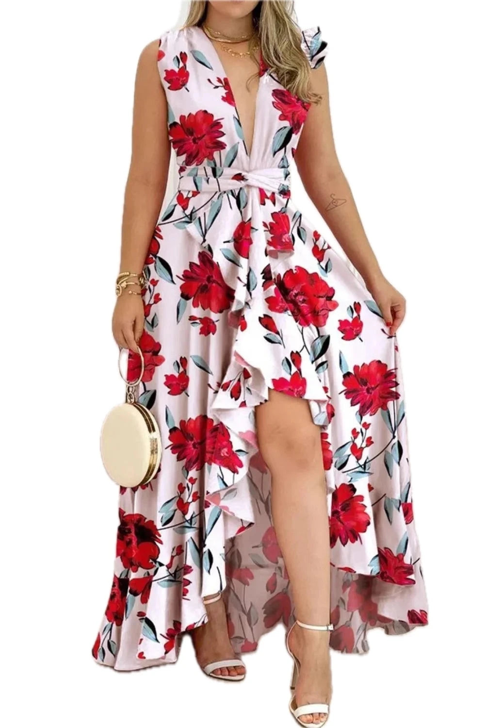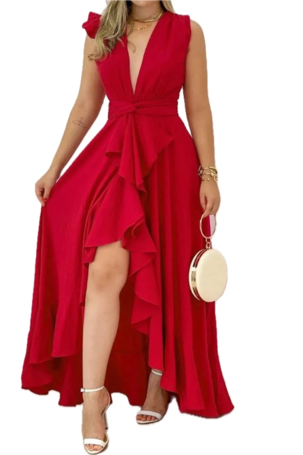 Women's Ruffled Plunge Sleeveless Maxi Dress with Dramatic Side Ruffles and Flowing Silhouette Fabric 100% Spandex