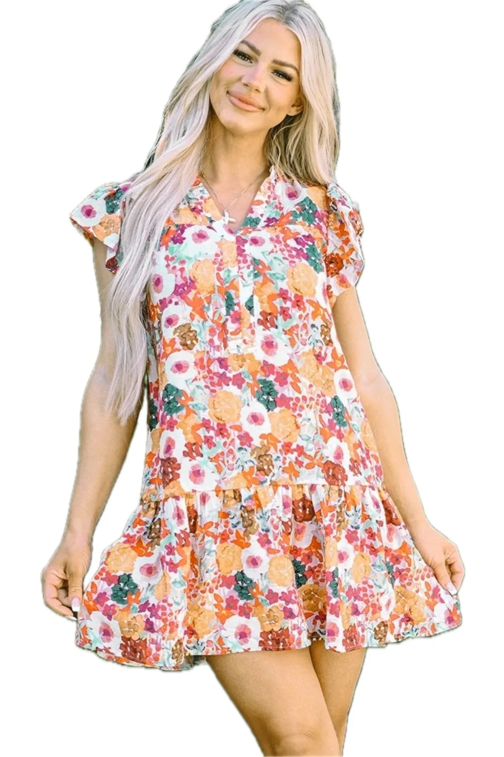 Women's Ruffled Printed Cap Sleeve Mini Dress 81% viscose 19% polyamide Lightweight Drapey Silky Feel Everyday Wear