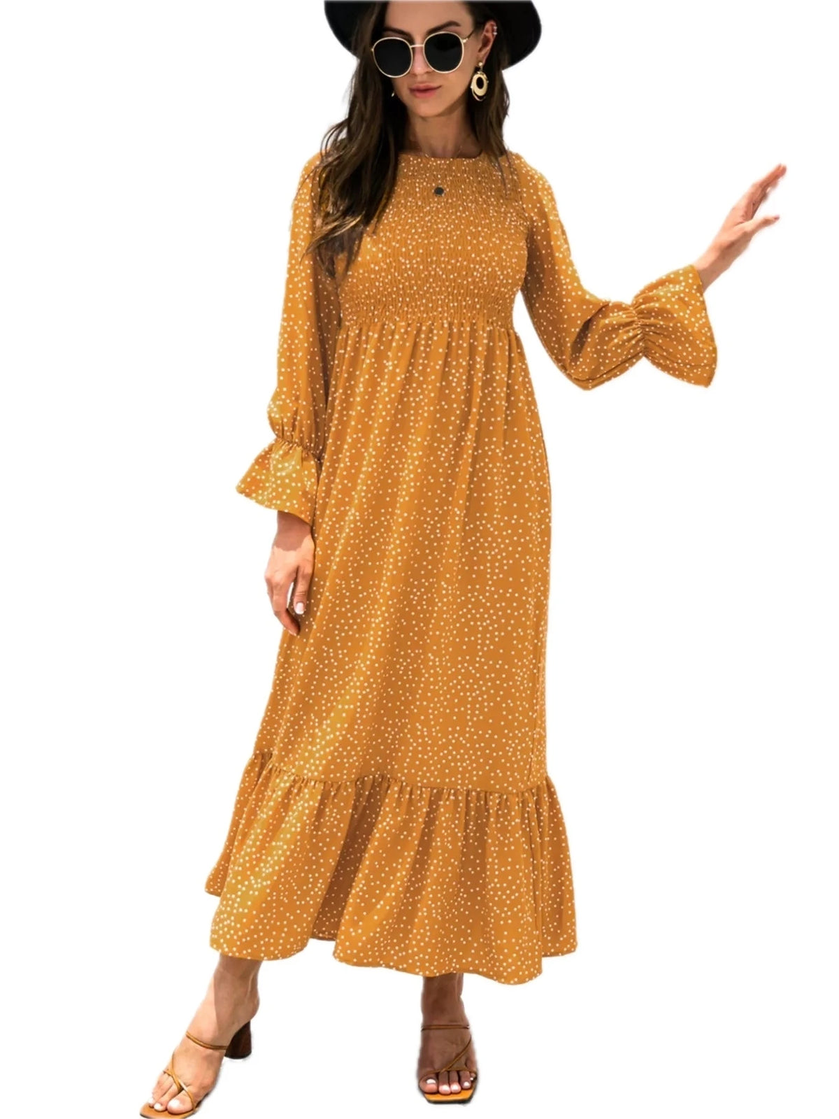 Women's Ruffled Printed Long Sleeve Maxi Dress 95% Polyester 5% Spandex Fabric for Elegant Floor Length Style