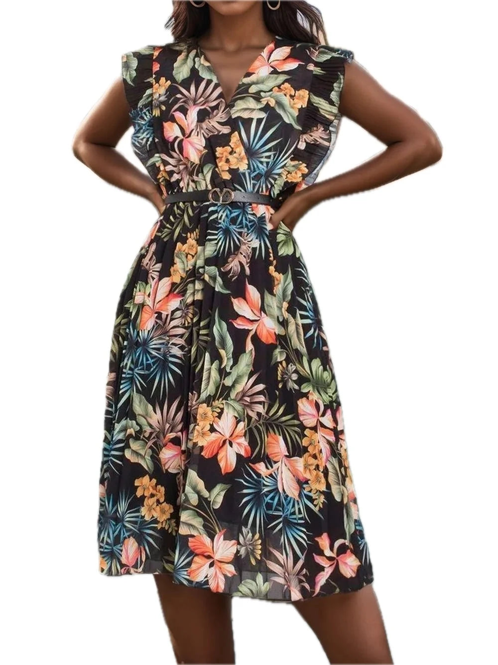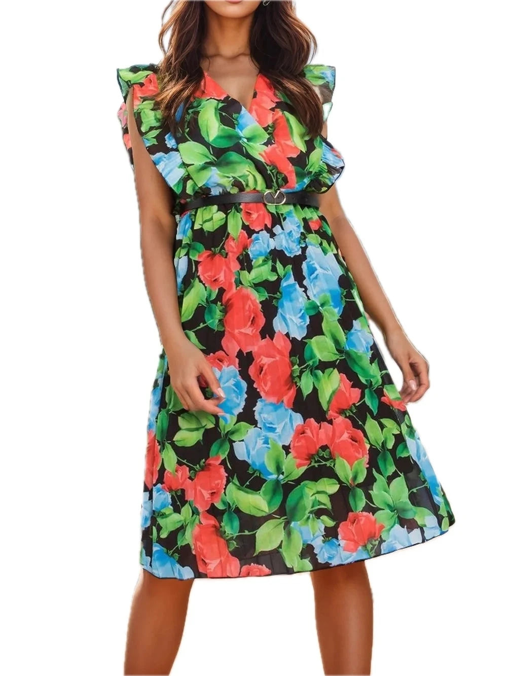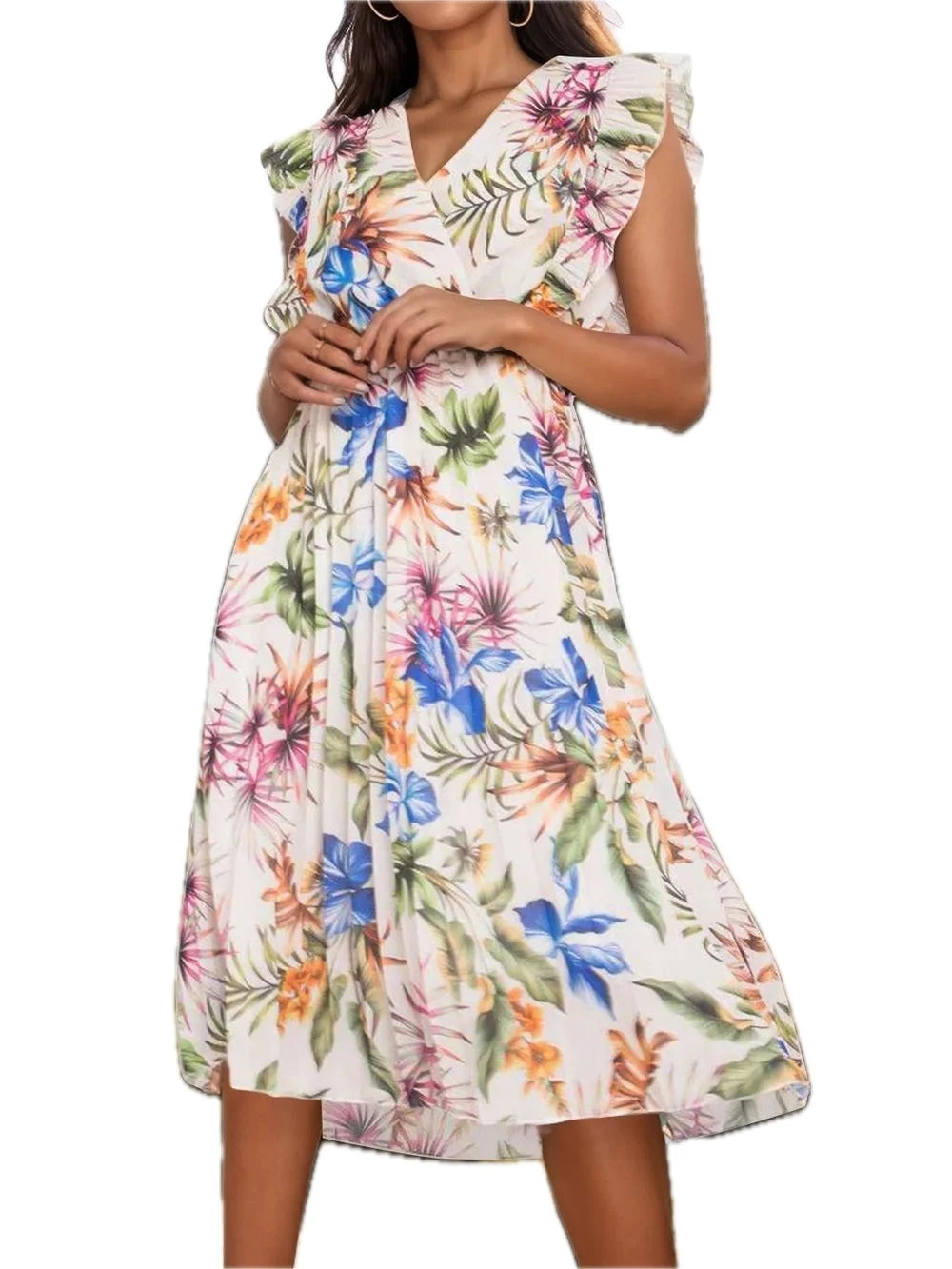 Women's Ruffled Printed Surplice Cap Sleeve Dress with Ruched Sheer Overlay and 100% Polyester fabric for events