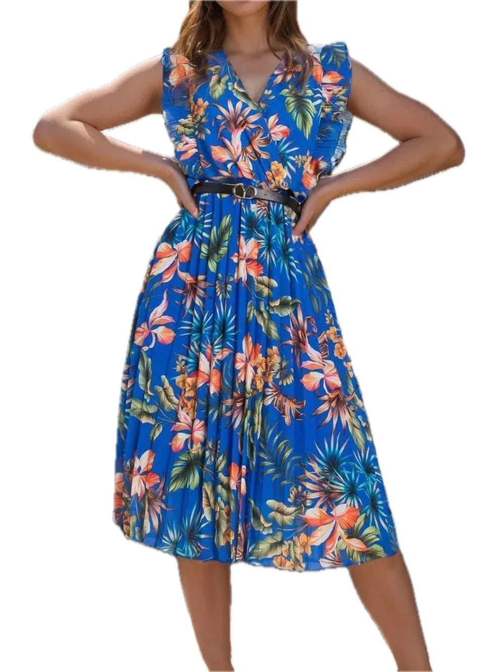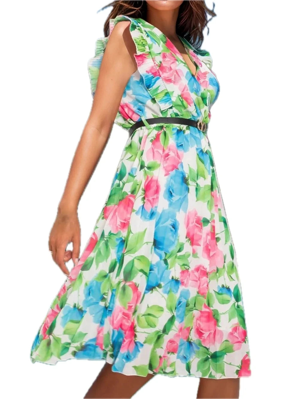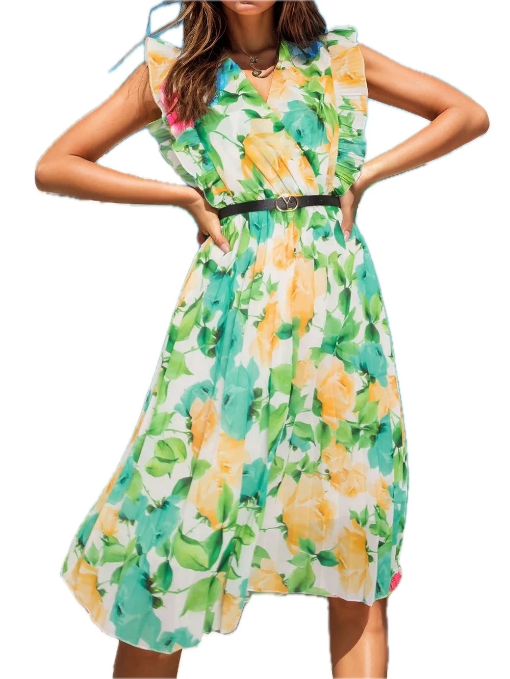 Women's Ruffled Printed Surplice Cap Sleeve Dress with Ruched Sheer Overlay and 100% Polyester fabric for events