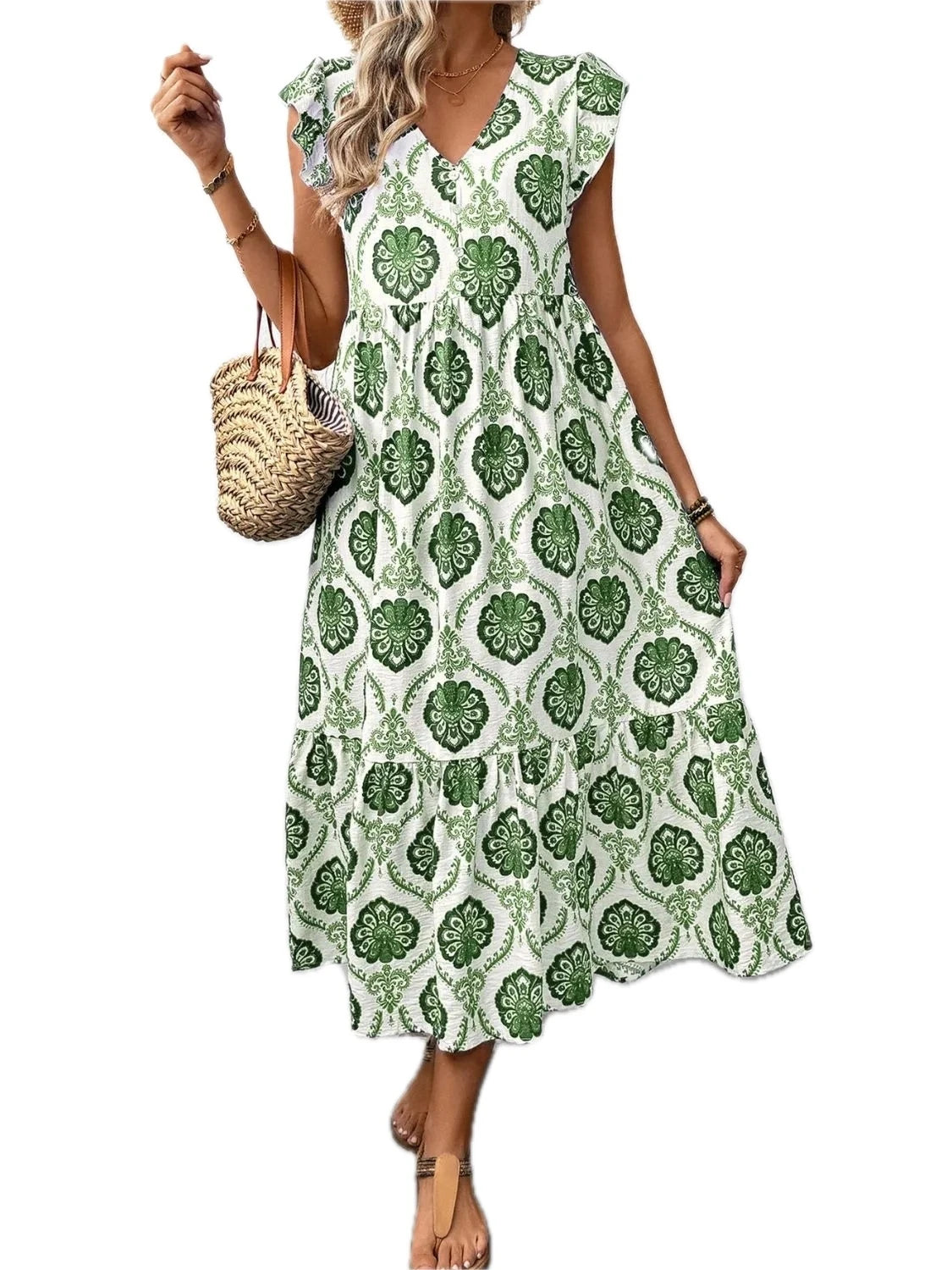 Men's Ruffled Printed V Neck Cap Sleeve Dress Ruched Bodice soft viscose % eighty three and polyamide % seventeen
