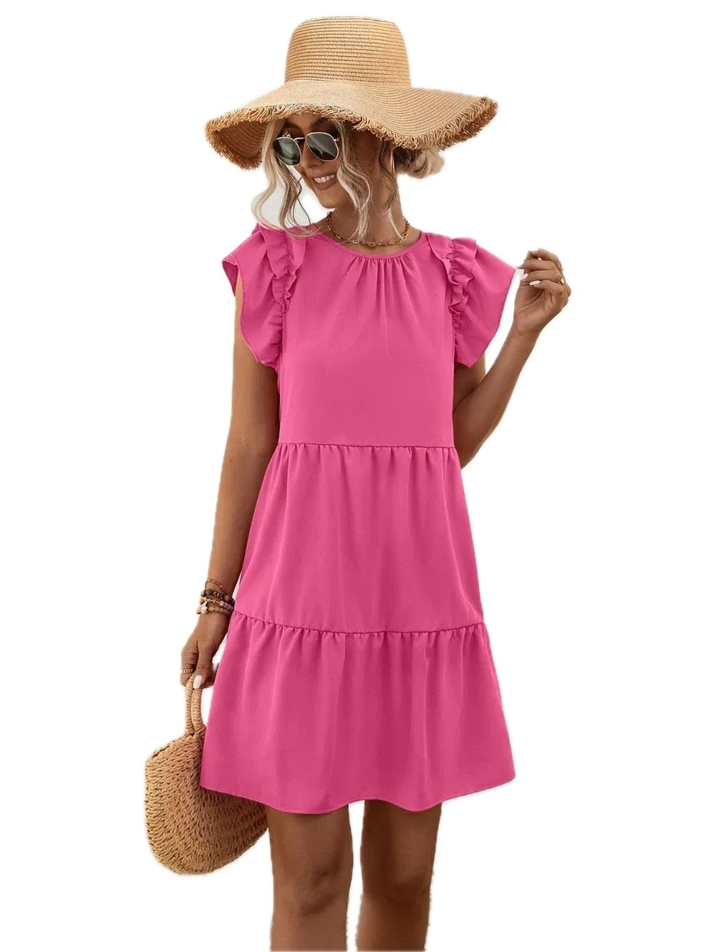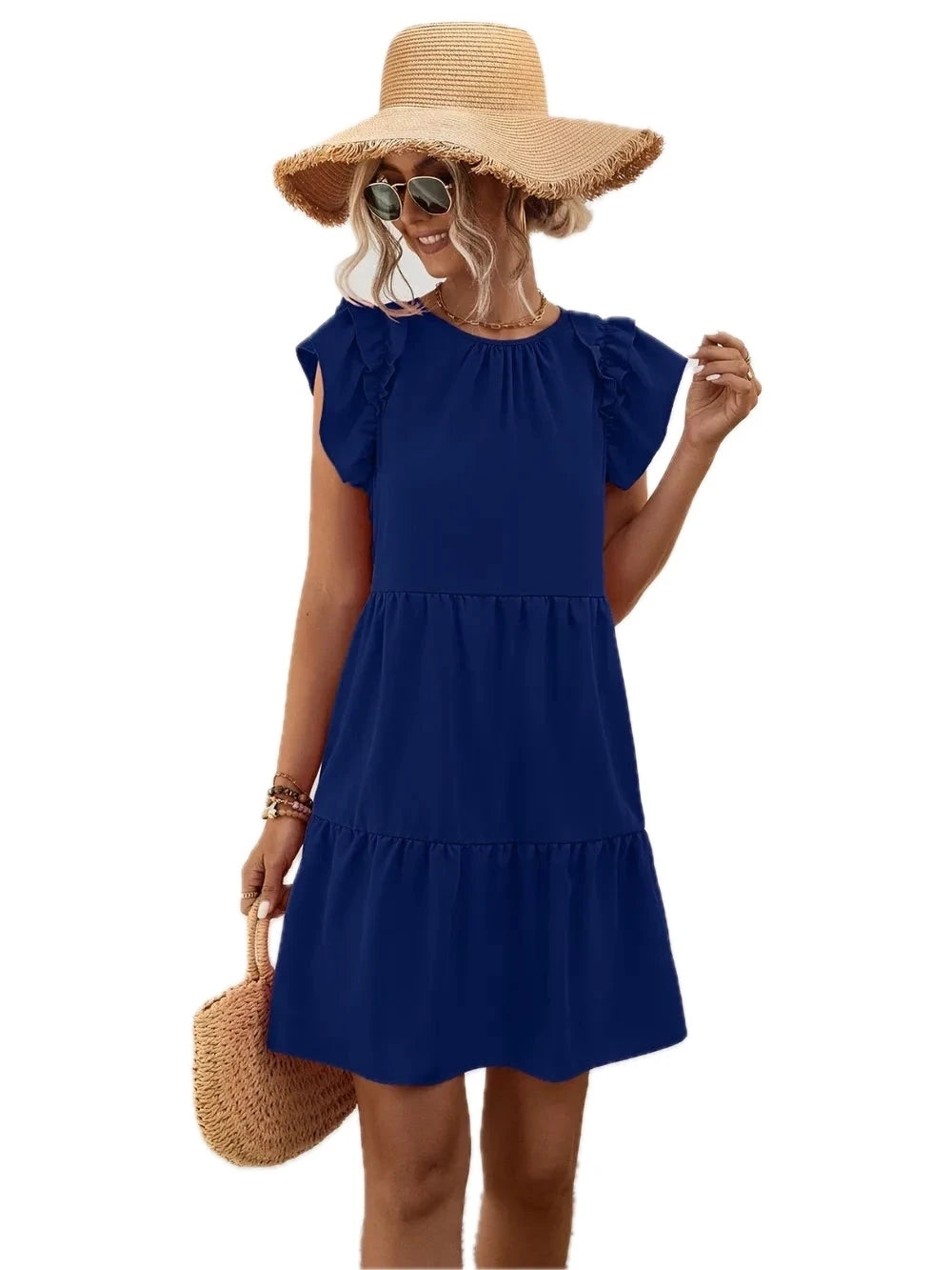 Women's Ruffled Round Neck Cap Sleeve Mini Dress With Sheer Overlay Ninety five % Polyester and five % Elastane