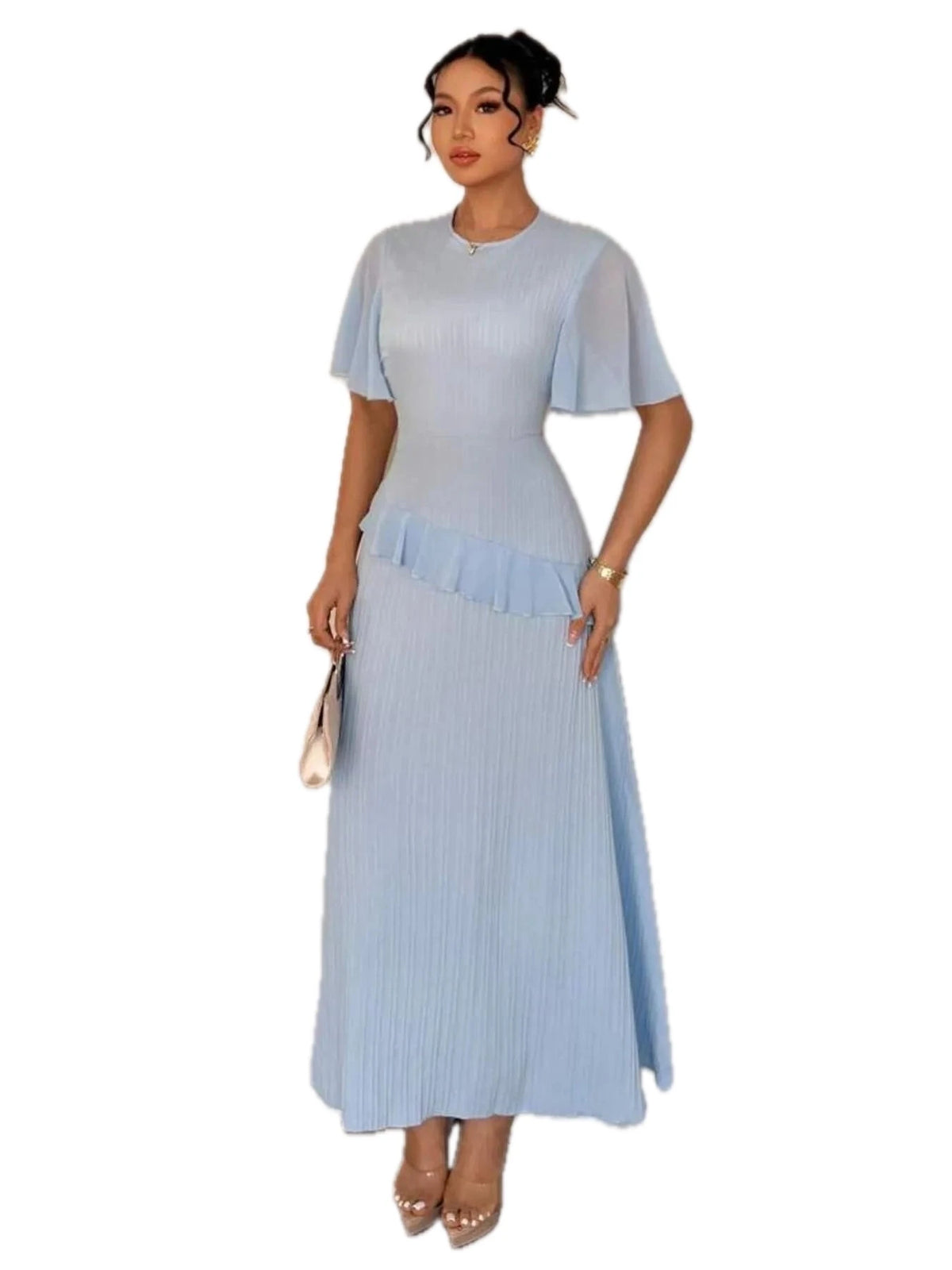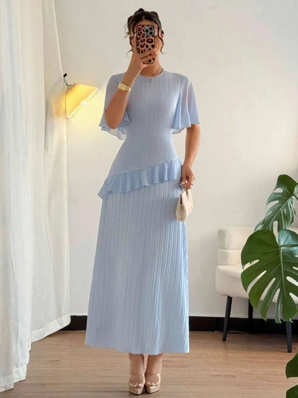 Women's Ruffled Round Neck Flutter Sleeve Dress 100% Polyester Lightweight Silhouette for Day to Night Wear Versatile