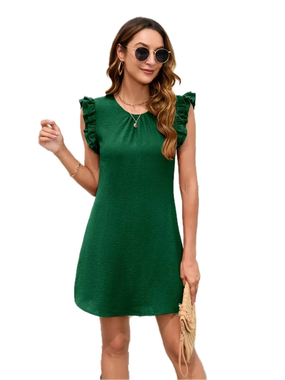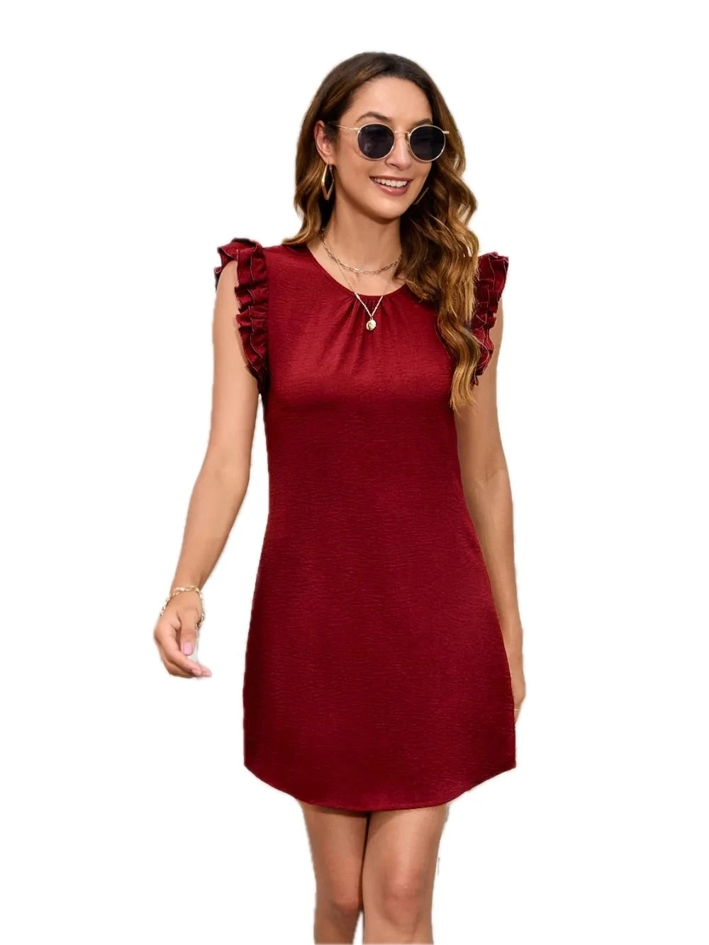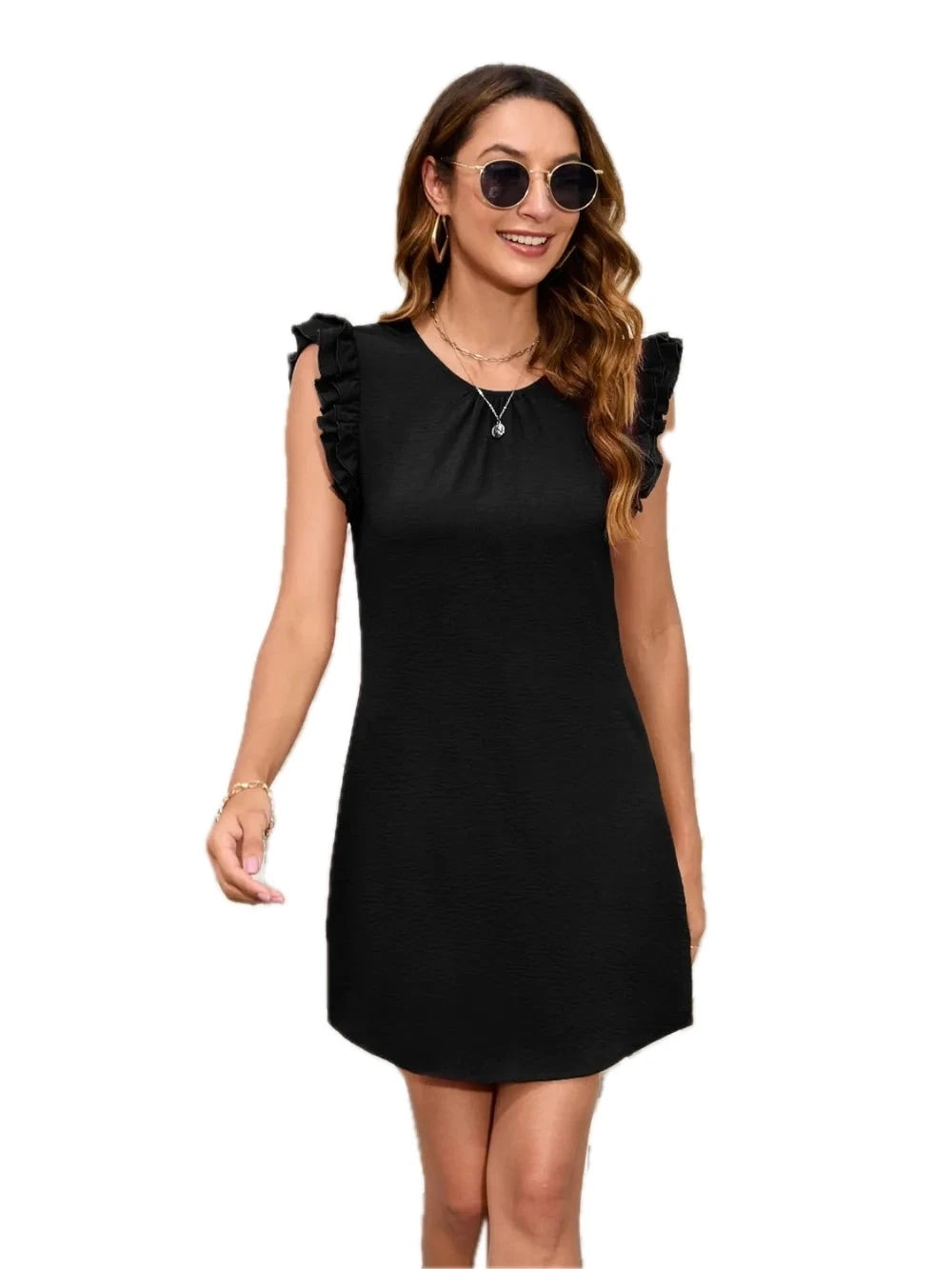 Women's Ruffled Round Neck Mini Dress with Sheer Overlay in 100% Polyester Fabric for Elegant Everyday Wear Chic