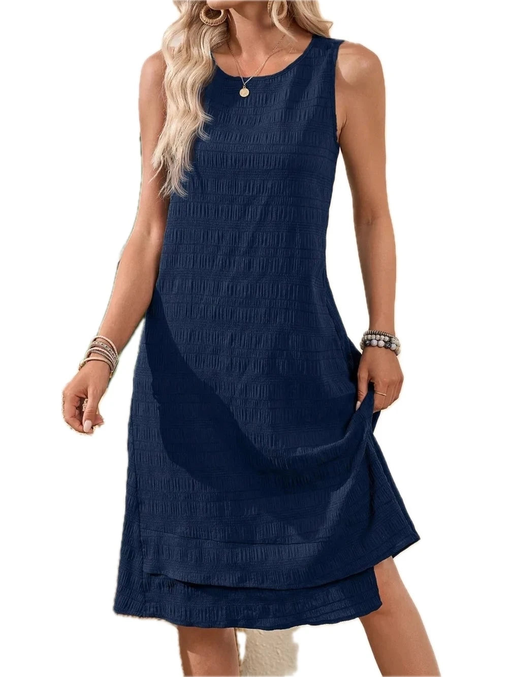 Women's Ruffled Textured Round Neck Sleeveless Dress with Asymmetrical Sheer Overlay 95% Polyester 5% Spandex Fabric
