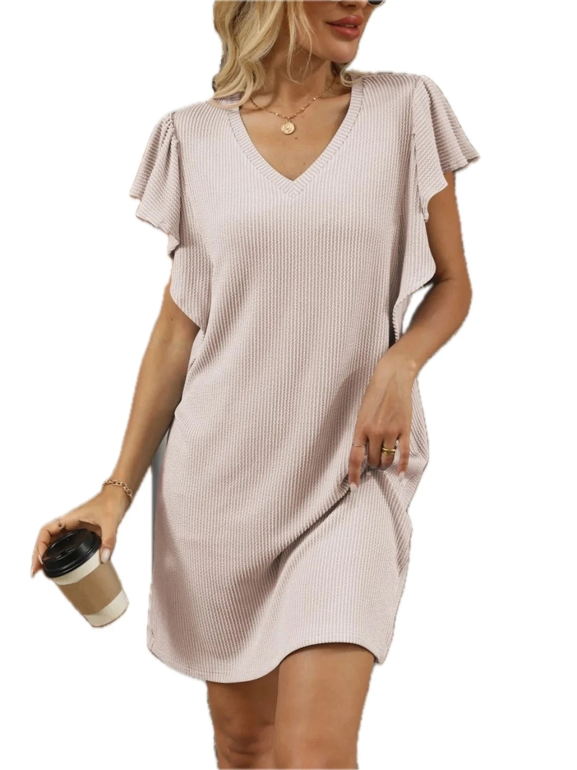 Women's Ruffled V Neck Cap Sleeve Mini Dress with Ribbed Texture and Stretch 65% Viscose 35% Polyester Imported