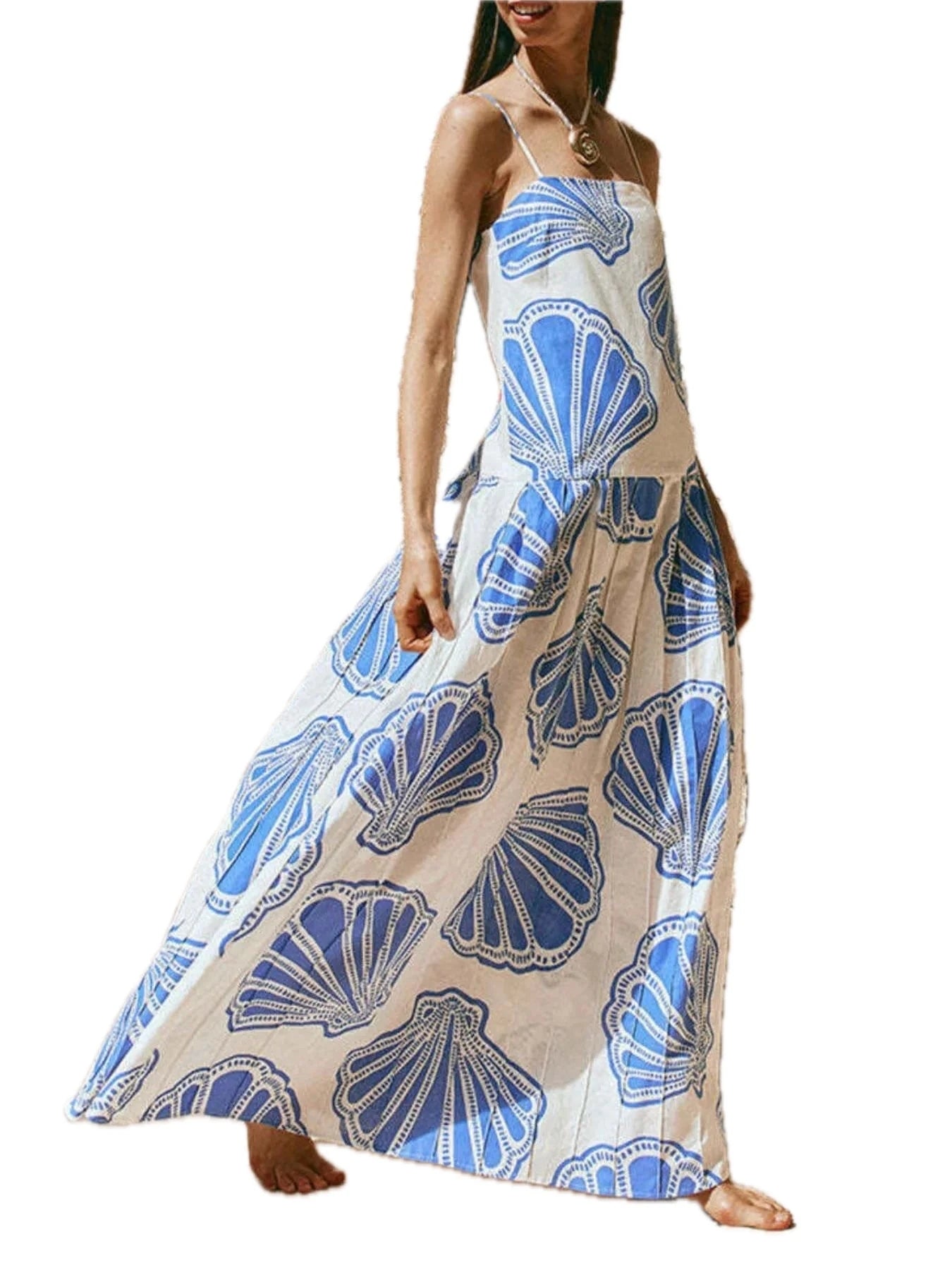 Womens Seashell Print Maxi Cami Dress with Tie Front and Slit for Women Slightly Stretchy 100% Polyester Fabric