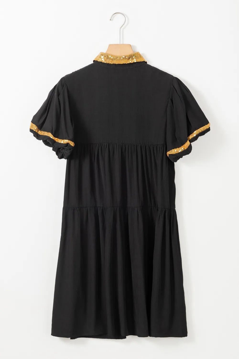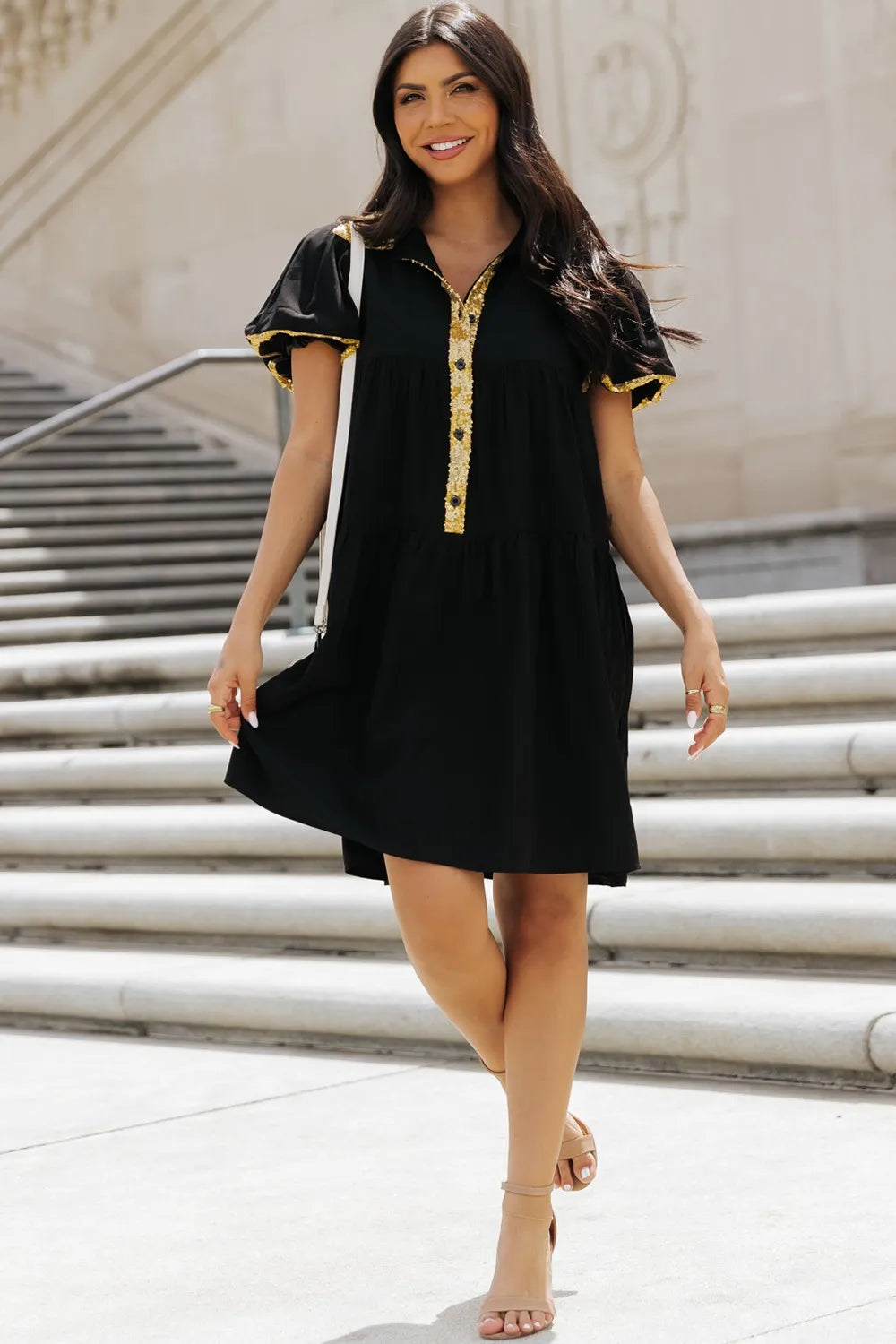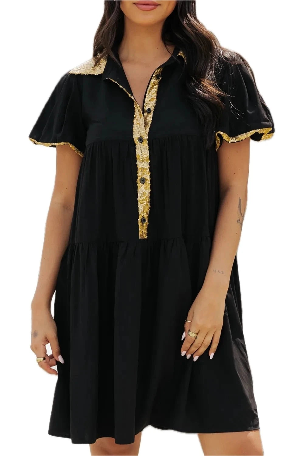 Women's Sequin Half Button Short Sleeve Dress with Sparkling Front Detail for Party Wear 50% Polyester 50% Viscose