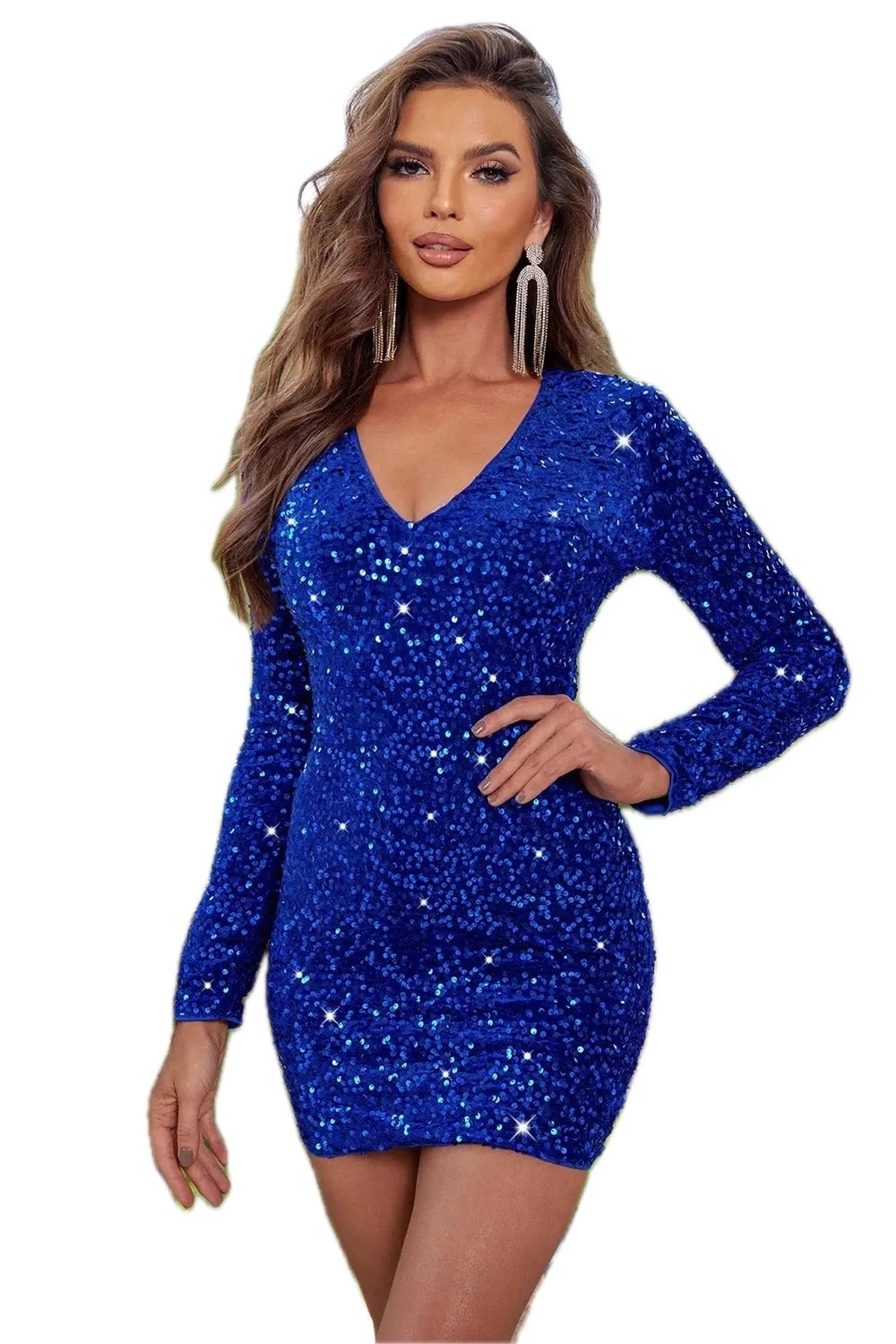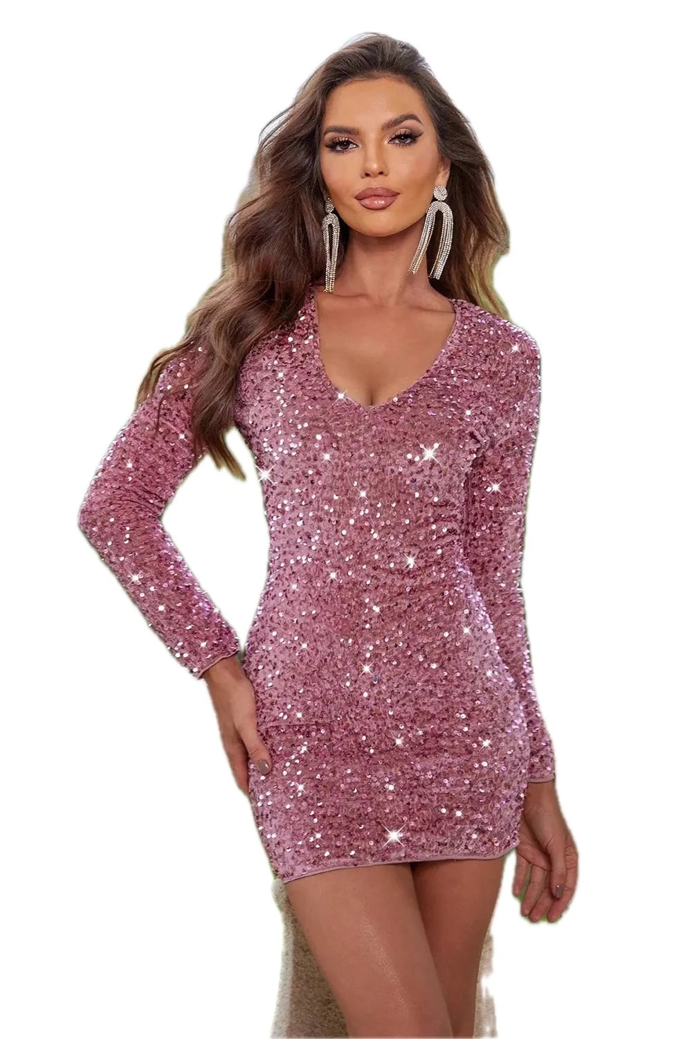 Women's Sequin V Neck Long Sleeve Mini Dress 95% Polyester 5% Elastane Slight Stretch Ready to Shine for evenings