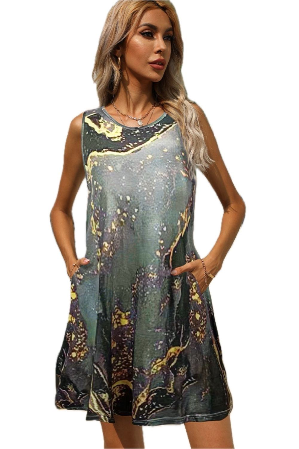 Women's Shiny Abstract Print Sleeveless Round Neck Dress with Pockets Featuring 95% polyester 5% spandex for comfort
