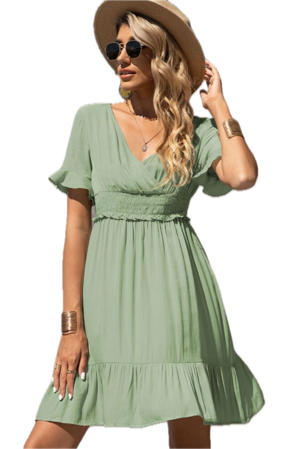 Women's Shiny Smocked Waist Flounce Sleeve Ruffle Hem Dress in Polyester 100% Fabric Casual Chic Mini Length Everyday