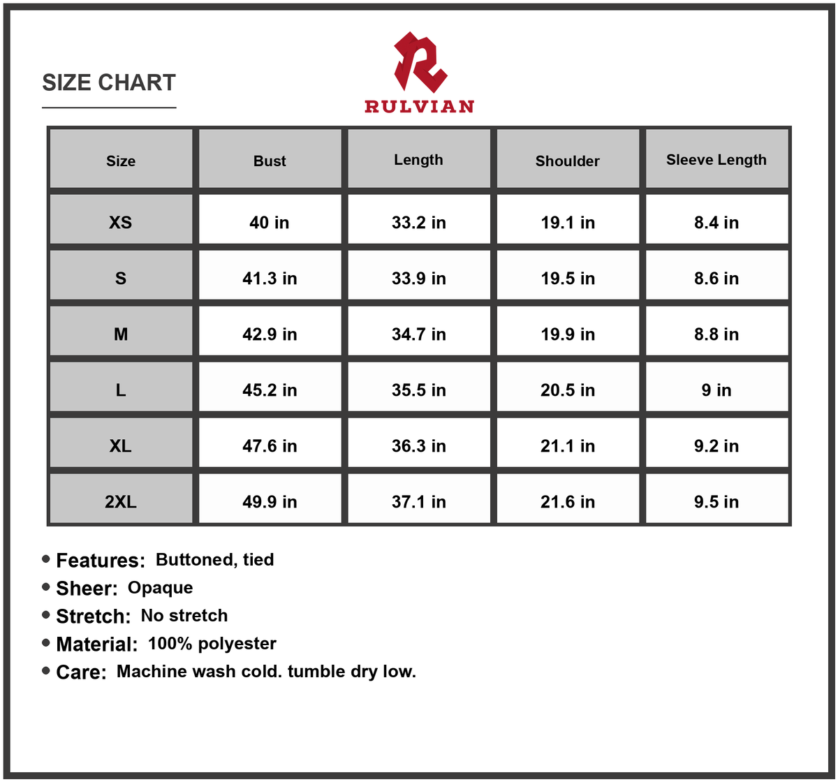 XS: bust 40 in, length 33.2 in, shoulder 19.1 in, sleeve length 8.4 in