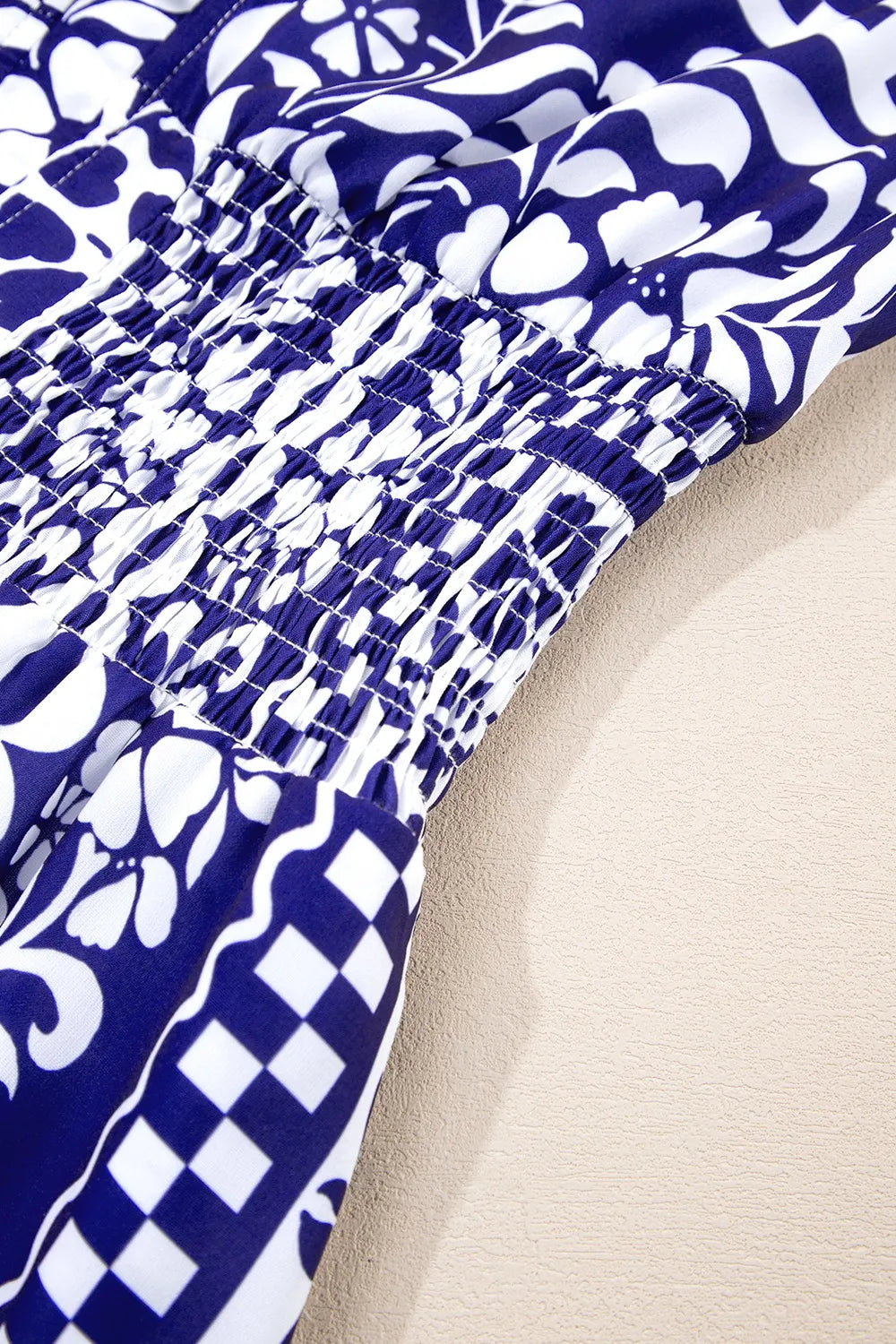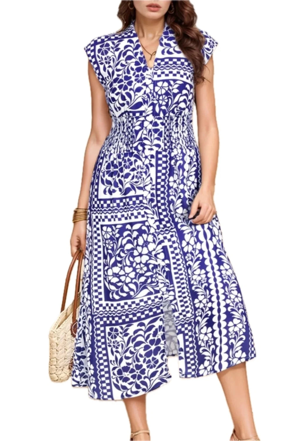 Women's Shirred Waist V Neck Sleeveless Floral Print Midi Dress 100% Polyester Lightweight Elegant Summer Look
