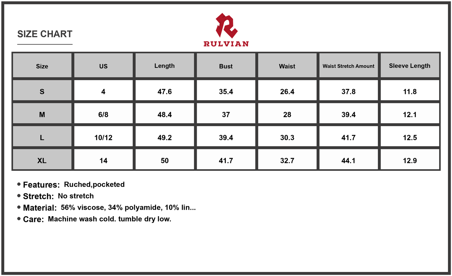 Size | US | Length | Bust | Waist | Waist Stretch Amount | Sleeve Length |