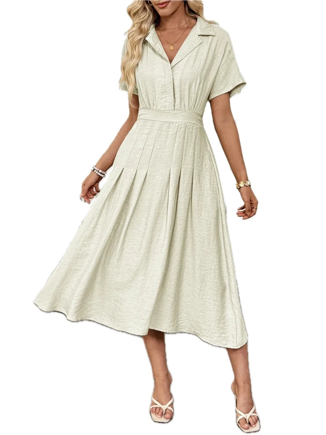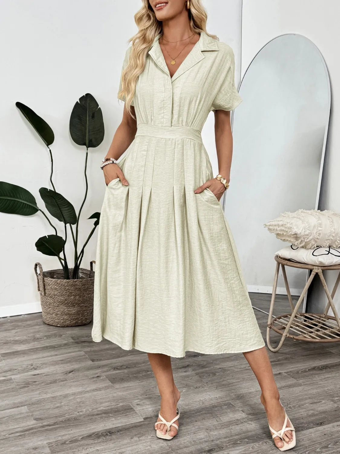 Women's Midi Dress with Pockets Ruched fifty six percent viscose thirty four percent polyamide ten percent linen
