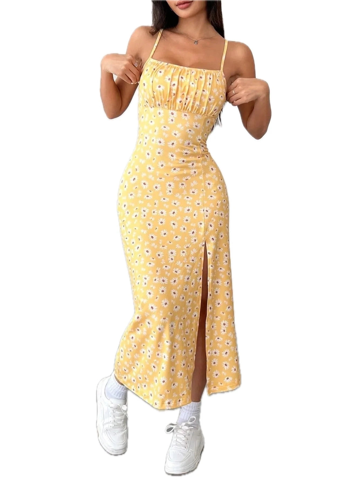 Women's Slit Bodice Midi Cami Dress with Ruched Detailing and Stretch in 100% Polyester Fabric for Day to Night Wear