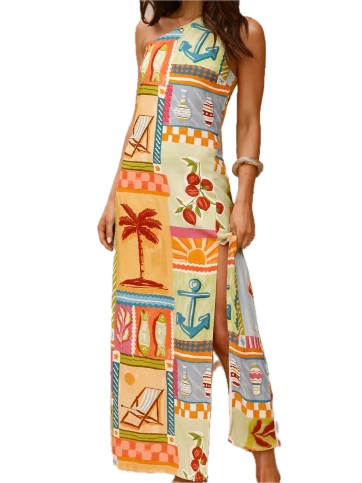 Women's Slit Printed Single Shoulder Maxi Dress 100% Polyester Fabric Flowy Summer Gown with Elegant Draped Silhouette