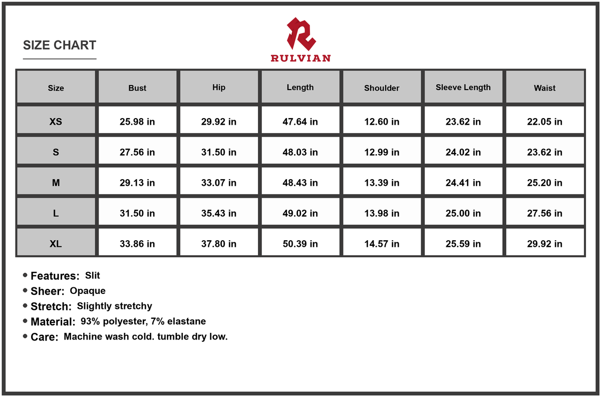S:Length 48.03 in, Bust 27.56 in, Waist 23.62 in, HIP 31.50 in, Shoulder 12.99 in, Sleeve Length 24.02 in