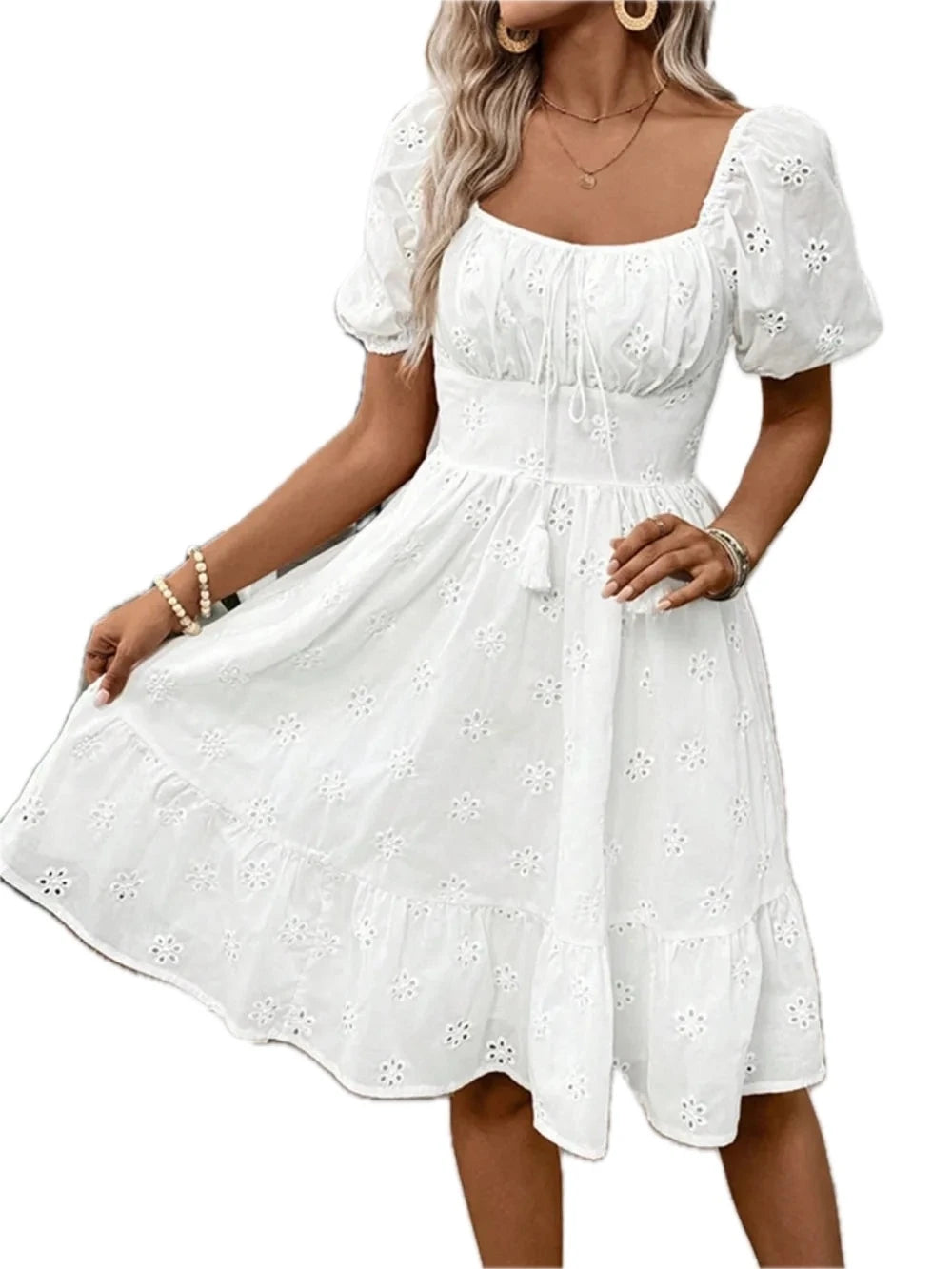 Women's Smocked Eyelet Square Neck Puff Sleeve Mini Dress Ninety Five Percent Polyester and Five Percent Spandex