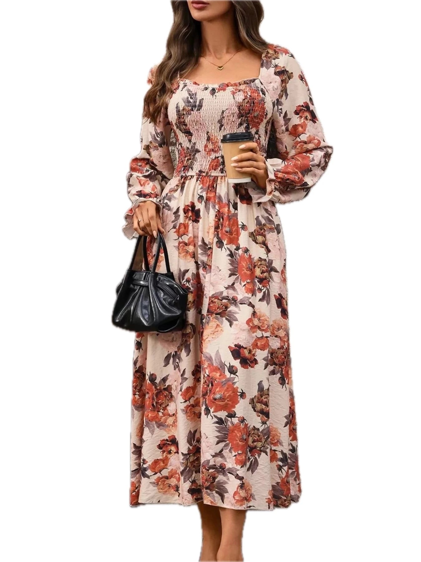 Women's Smocked Floral Print Flounce Sleeve Dress 88% viscose 12% polyamide Lightweight Stretchy Comfortable Everyday