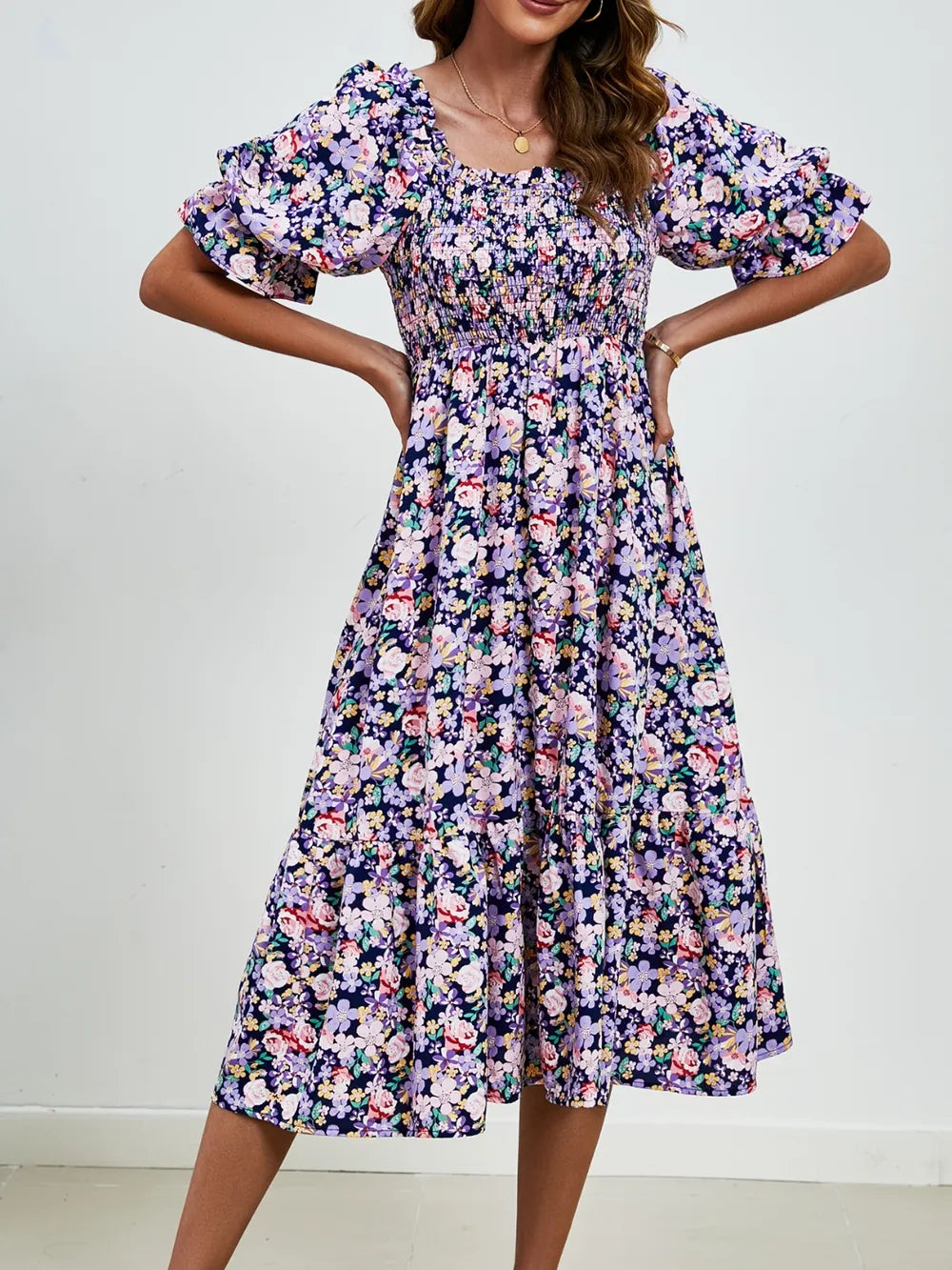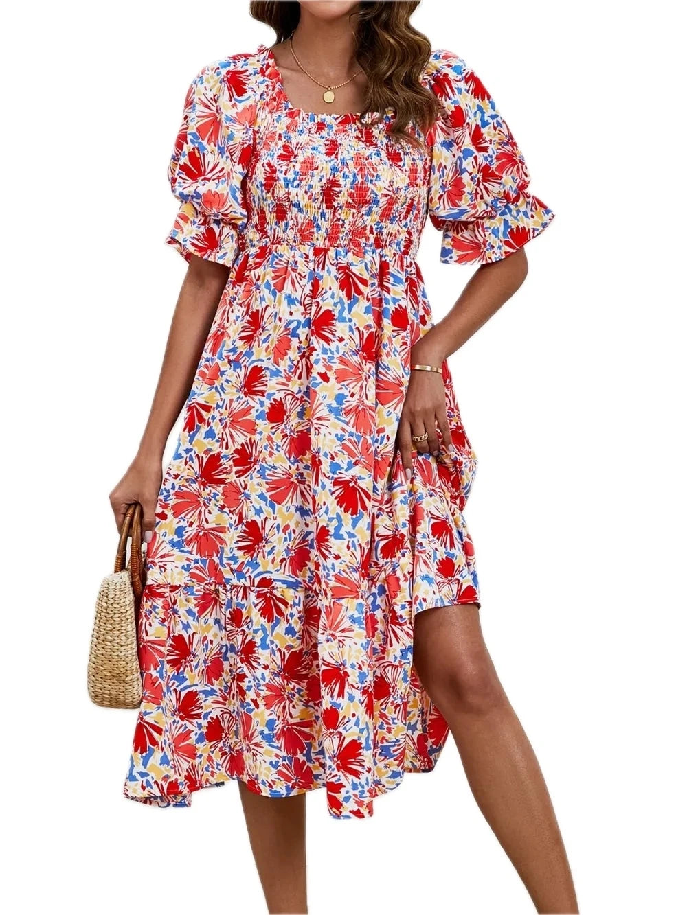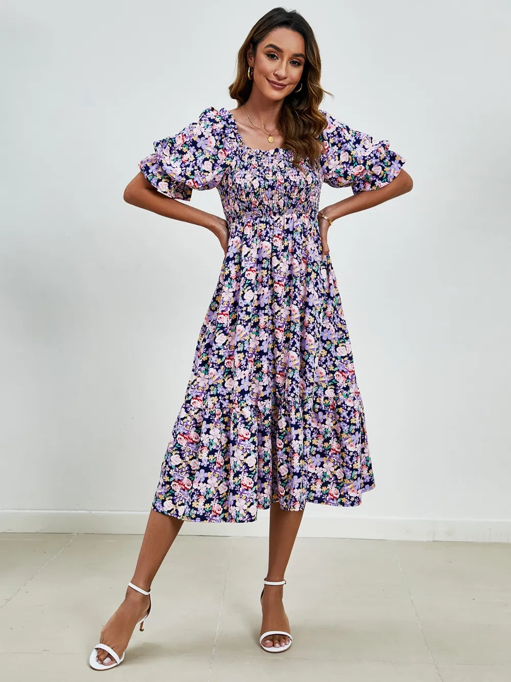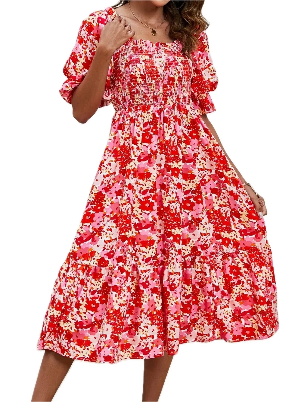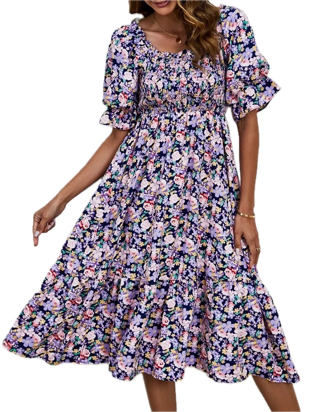 Women's Smocked Floral Square Neck Short Sleeve Dress 100% Polyester Lightweight Easy Care for Spring and Summer