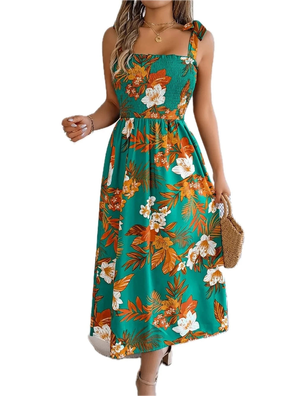 Women's Smocked Floral Tie Shoulder Cami Dress 100% Polyester Lightweight Vivid Print Summer Dress for Summer Days