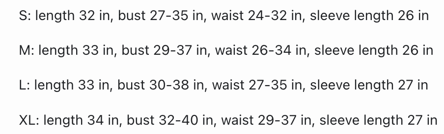 S: length 32 in, bust 27-35 in, waist 24-32 in, sleeve length 26 in