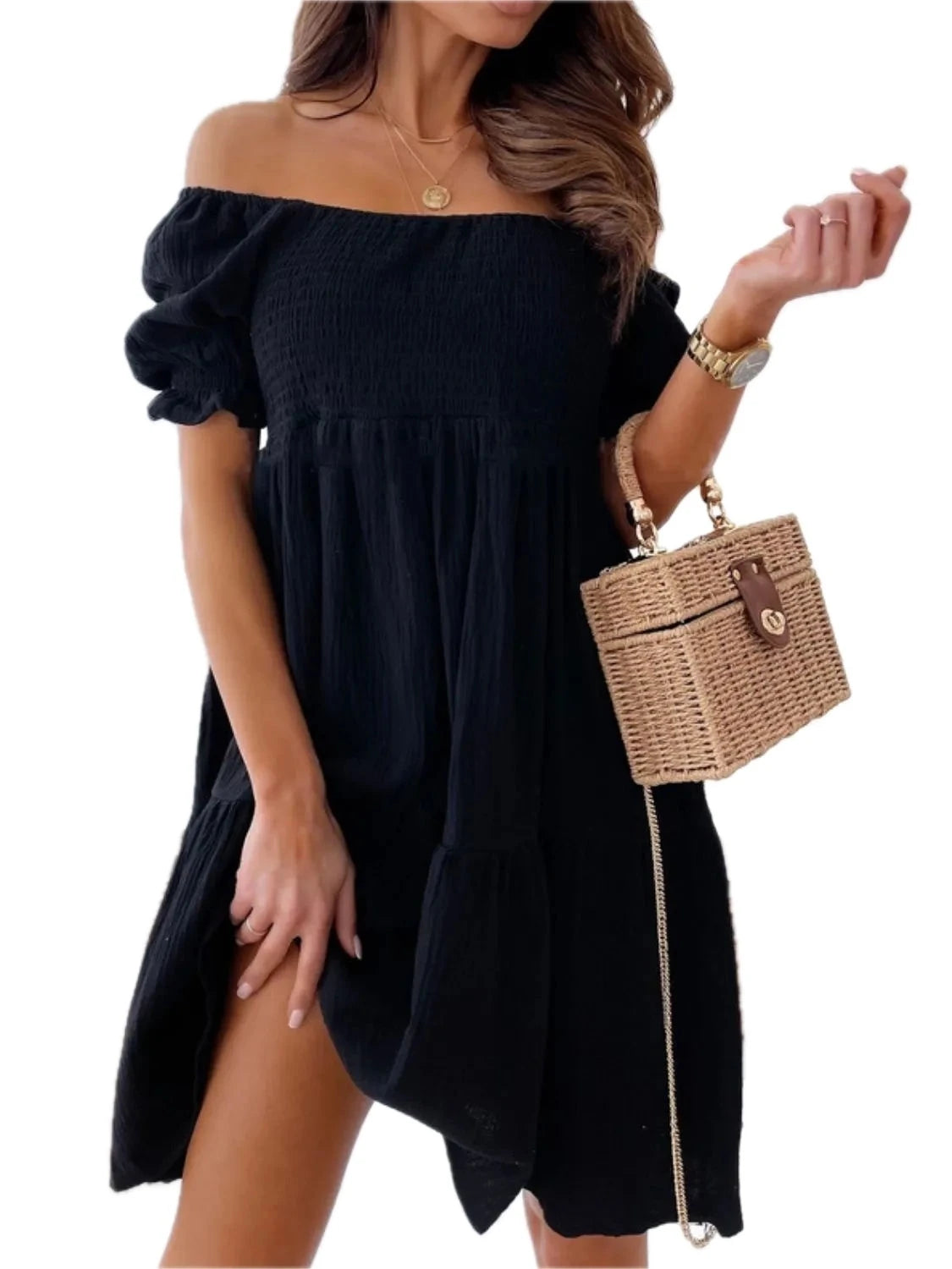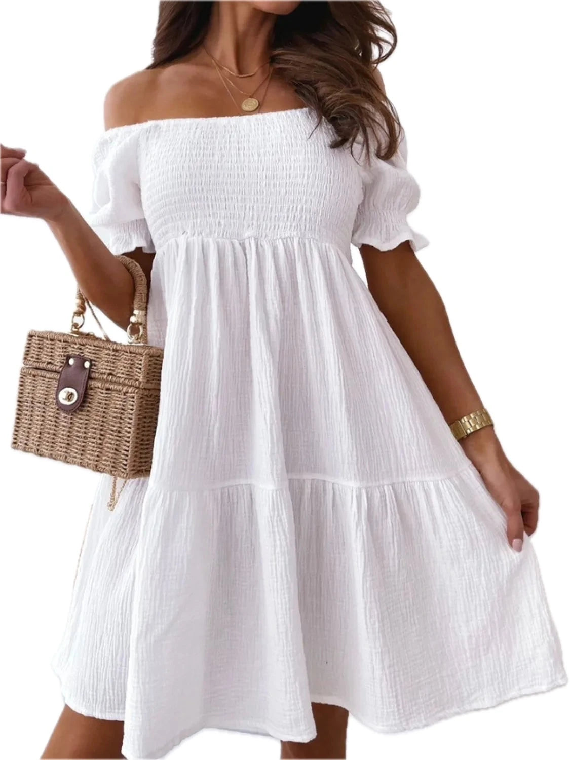 Men's Smocked Off Shoulder Mini Dress with Ruched Bust 100% Polyester Fabric Lightweight Beach Ready Style for Summer
