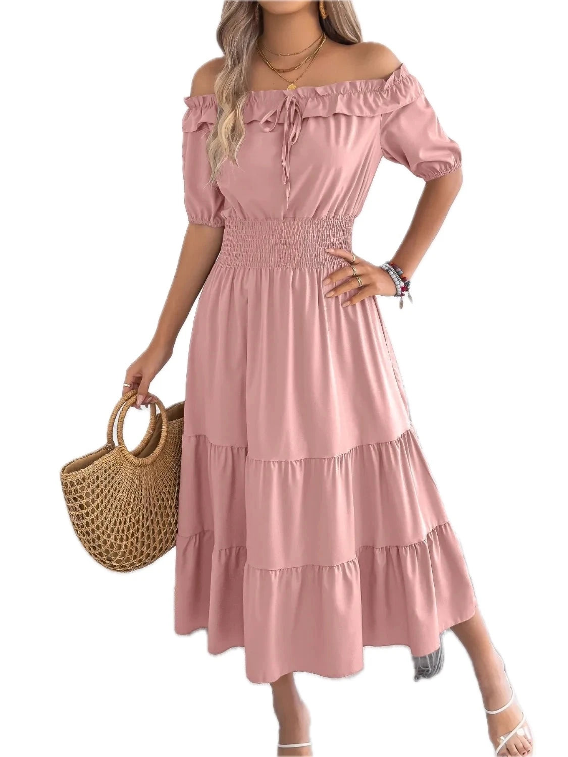 Women's Smocked Off Shoulder Tiered Dress with Ties and Ruffles for Summer and Party Wear 95% polyester 5% elastane