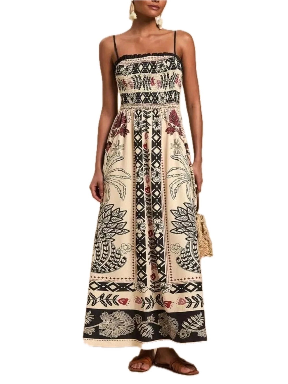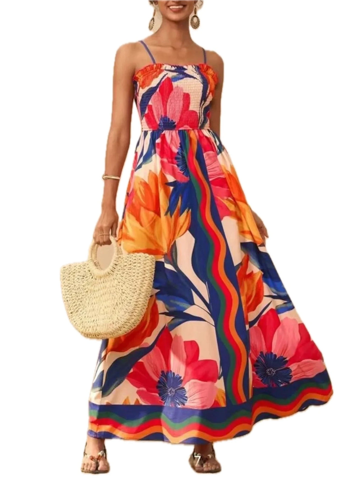 Women's Smocked Printed Spaghetti Strap Maxi Summer Dress with Lightweight 100% Polyester Fabric for Sunny Days