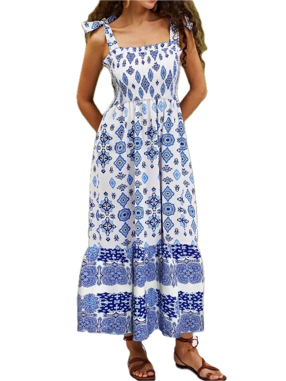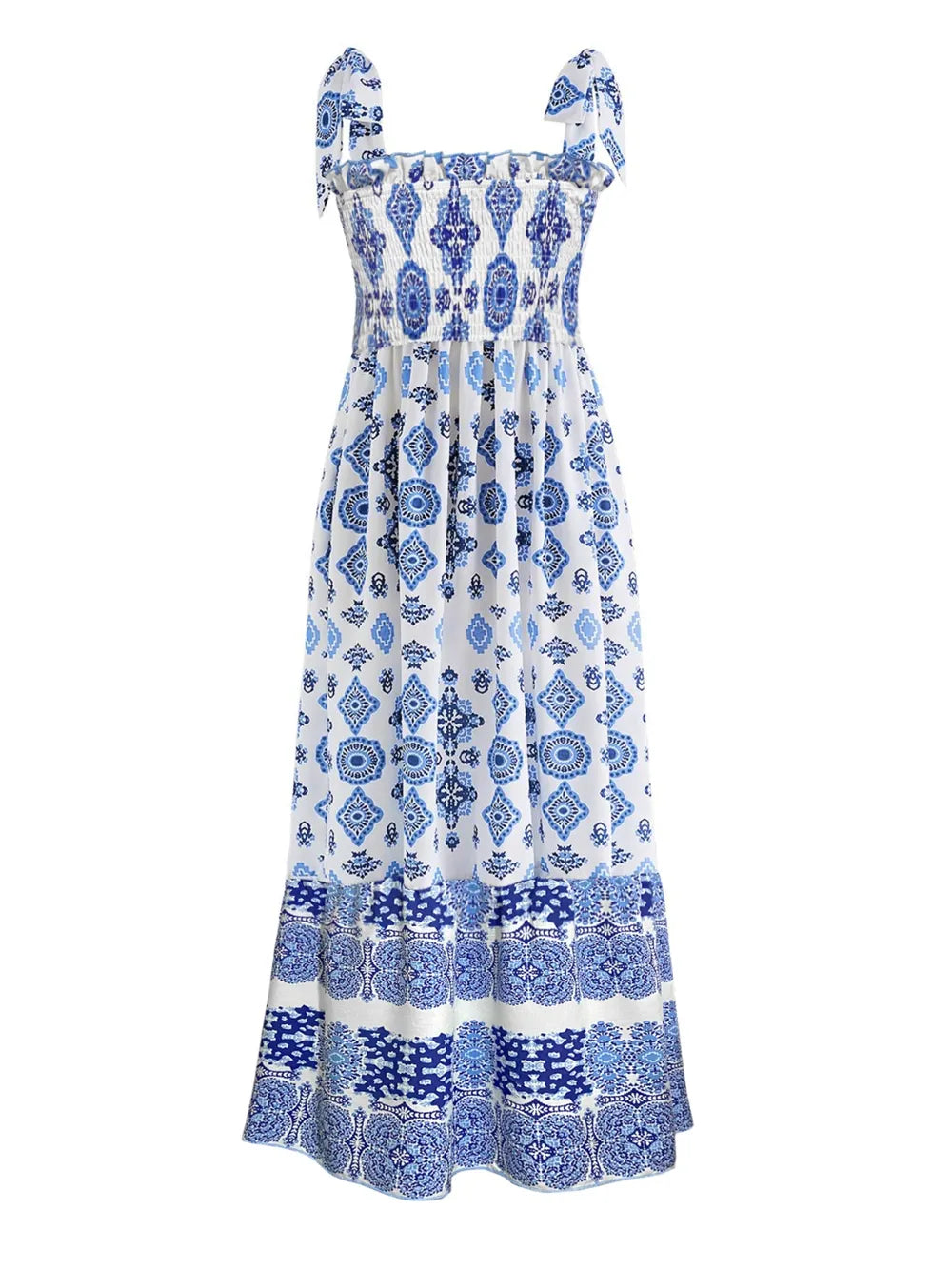 Women's Smocked Printed Square Neck Cami Dress 95% polyester 5% spandex for Flattering Silhouette and All Day Comfort