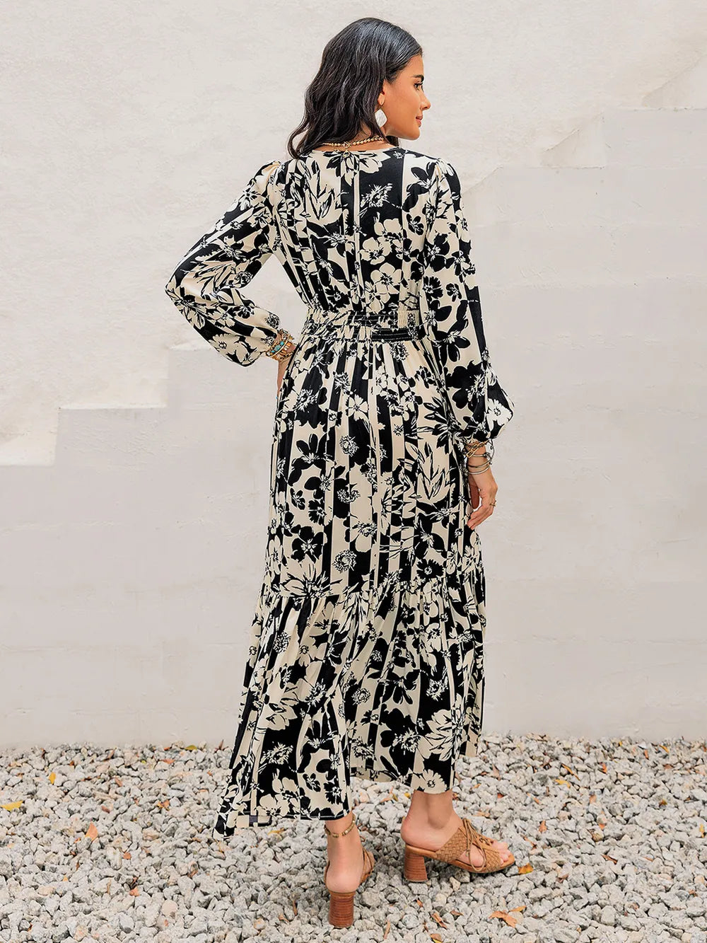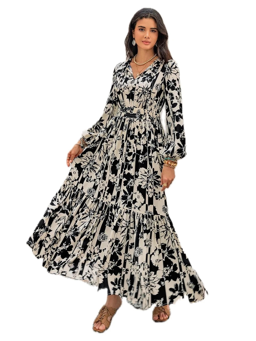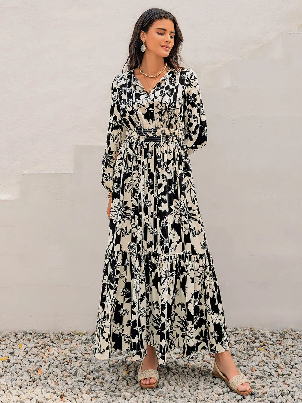 Women's Smocked Printed Tie Neck Long Sleeve Dress 100% Polyester Lightweight Elegant Everyday Wear For Work and Party