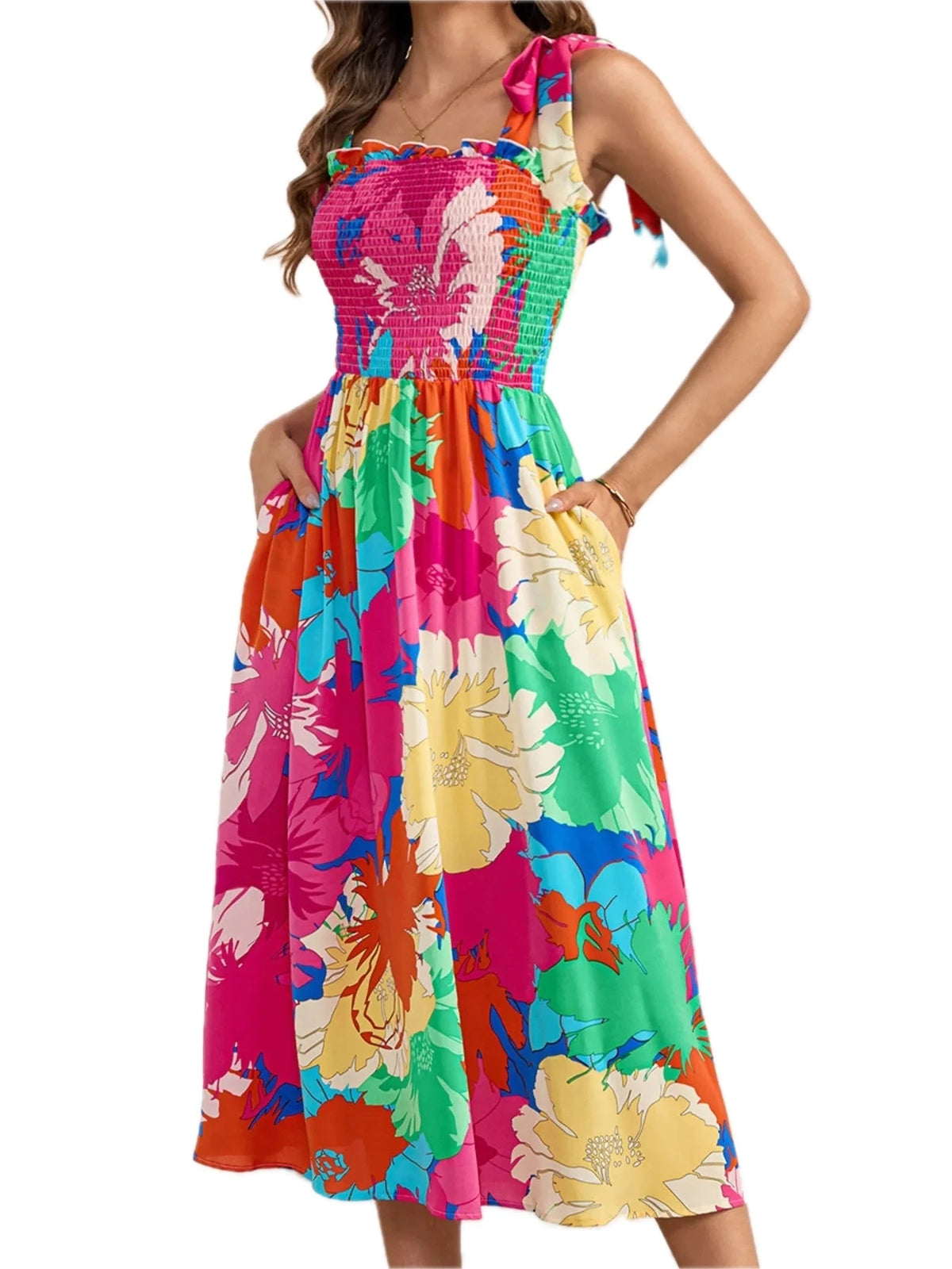 Women's Smocked Printed Tie Shoulder Midi Dress with Tiered Silhouette and 100% Polyester Fabric with a flowing drape