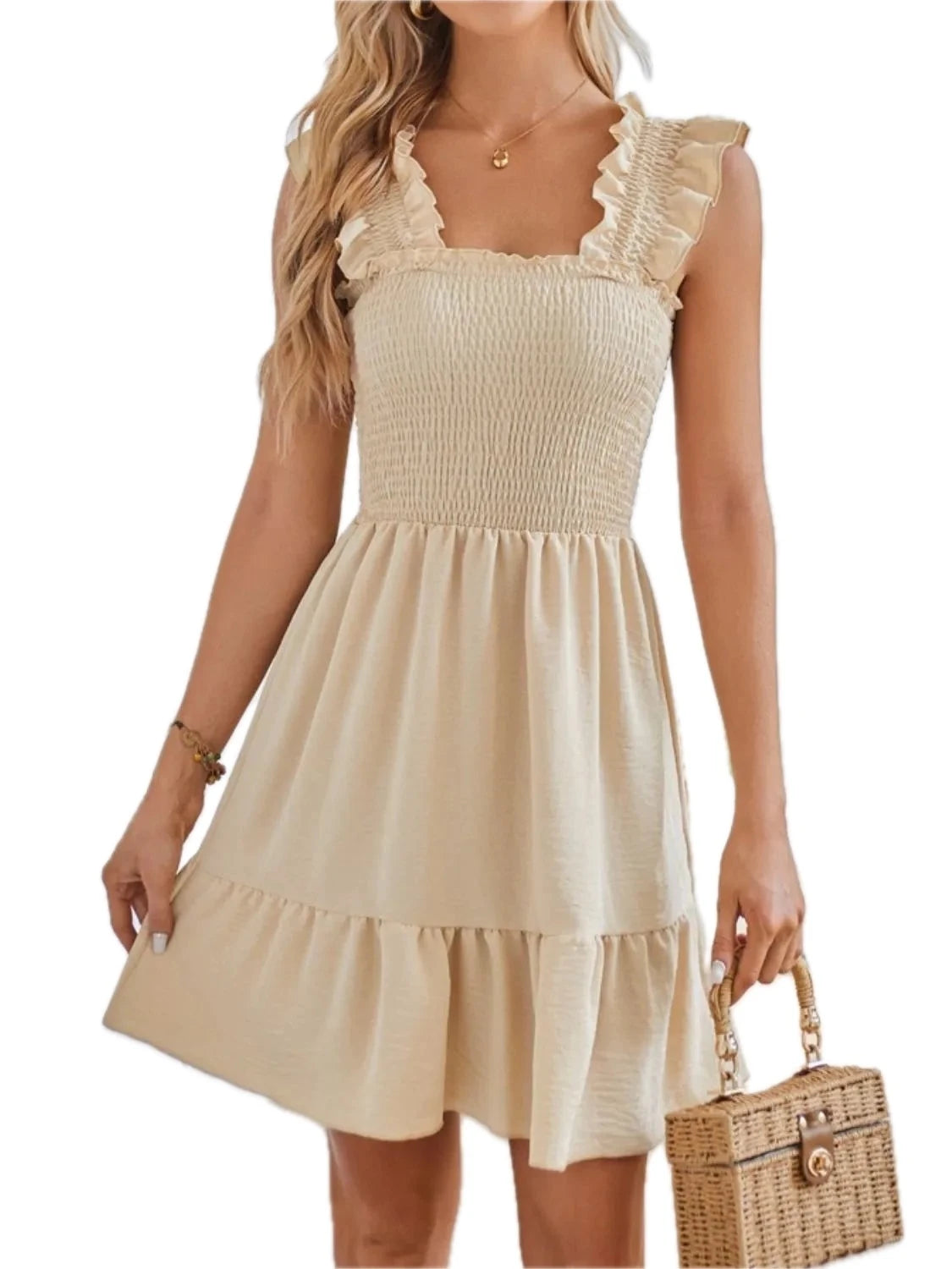 Women's Smocked Square Neck Wide Strap Dress with Ruched and Ruffled Details Sheer Overlay Stretch 100% Polyester