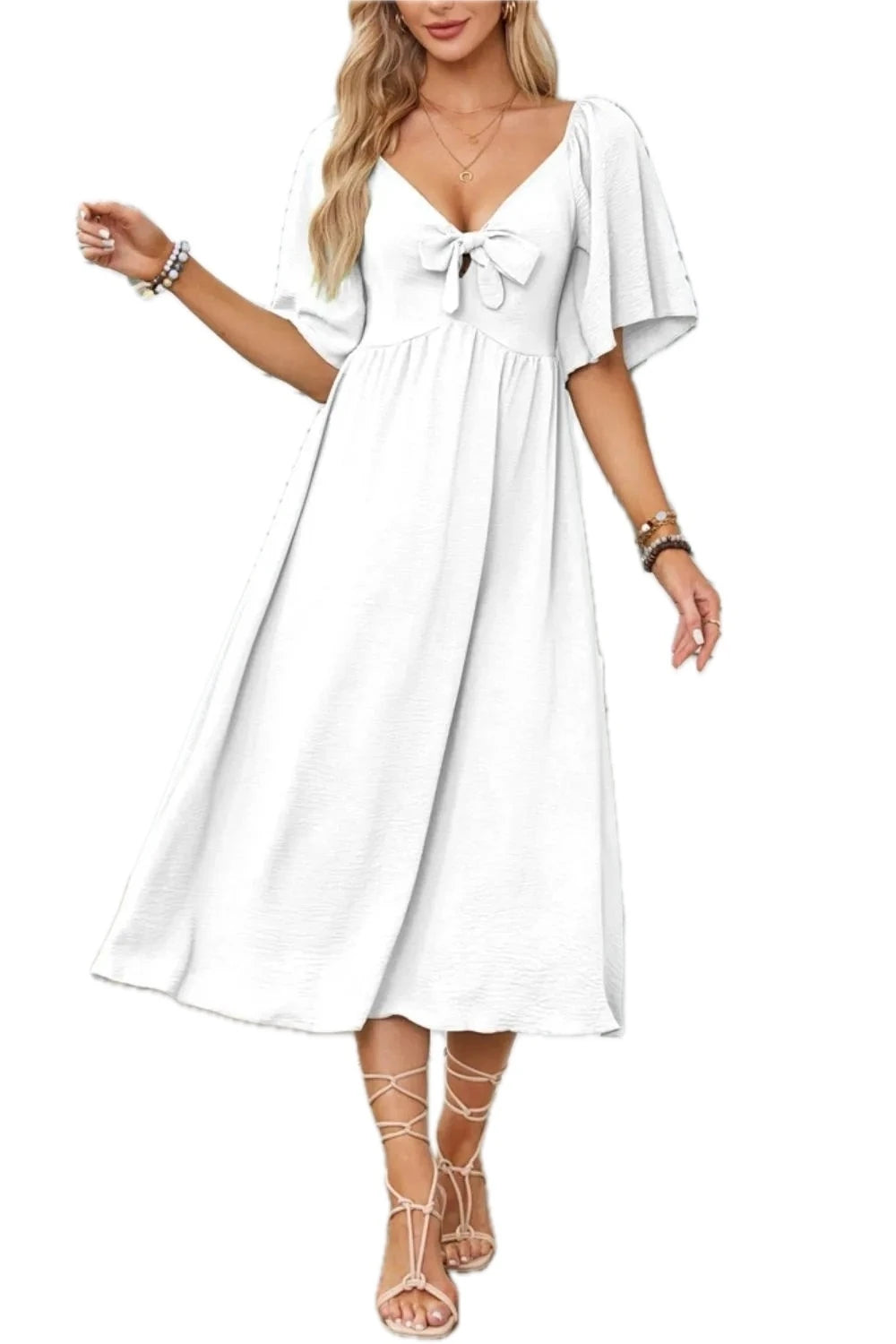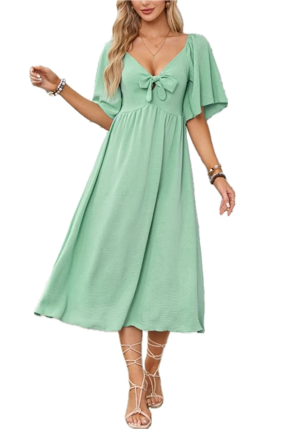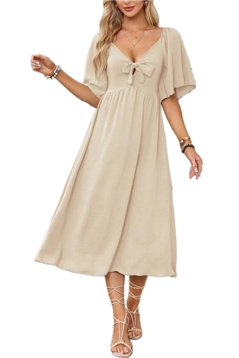 Women's Smocked Tie Front Flutter Sleeve Midi Dress with Opaque Bodice and Ruched Details 100% Polyester Party Ready