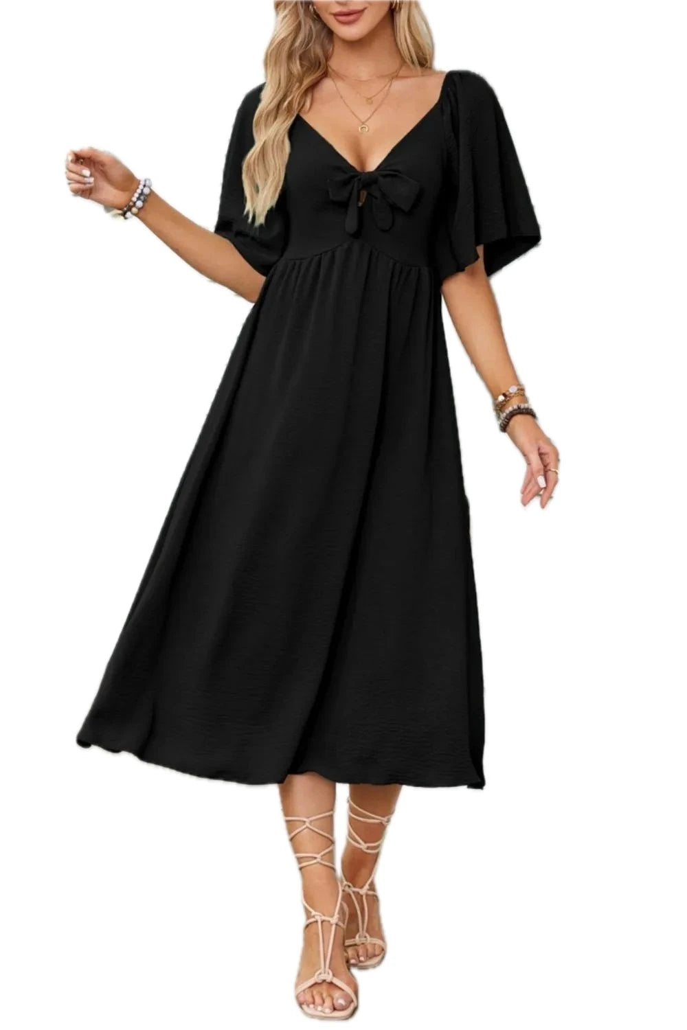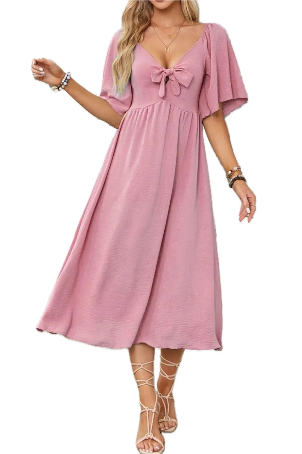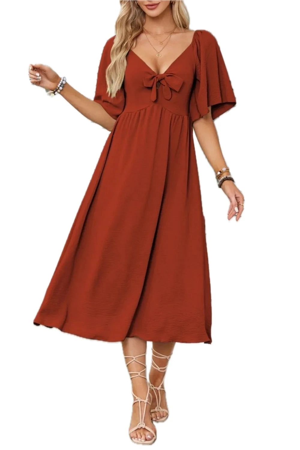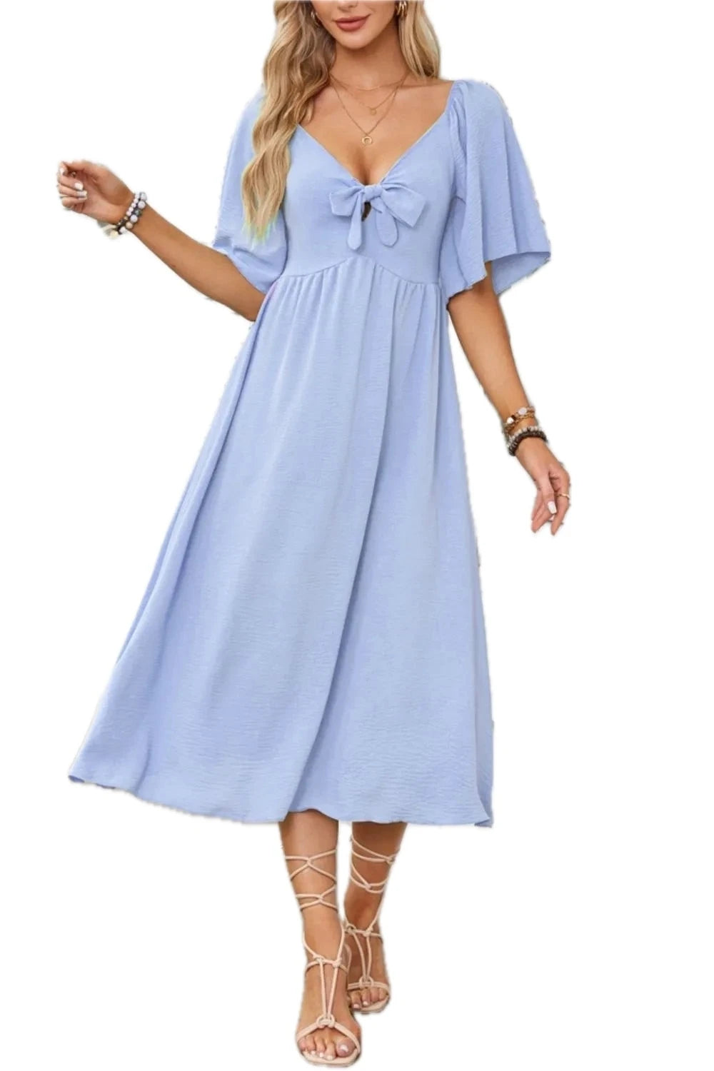 Women's Smocked Tie Front Flutter Sleeve Midi Dress with Opaque Bodice and Ruched Details 100% Polyester Party Ready