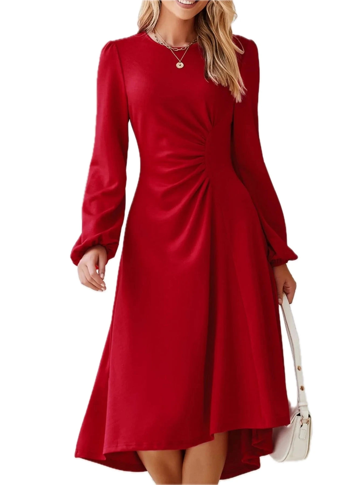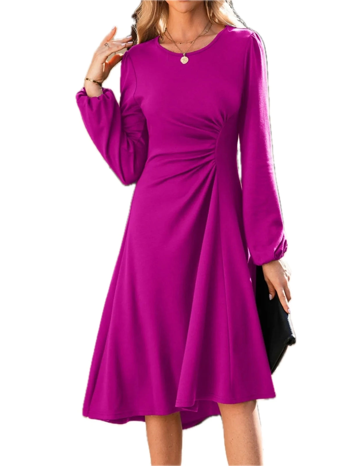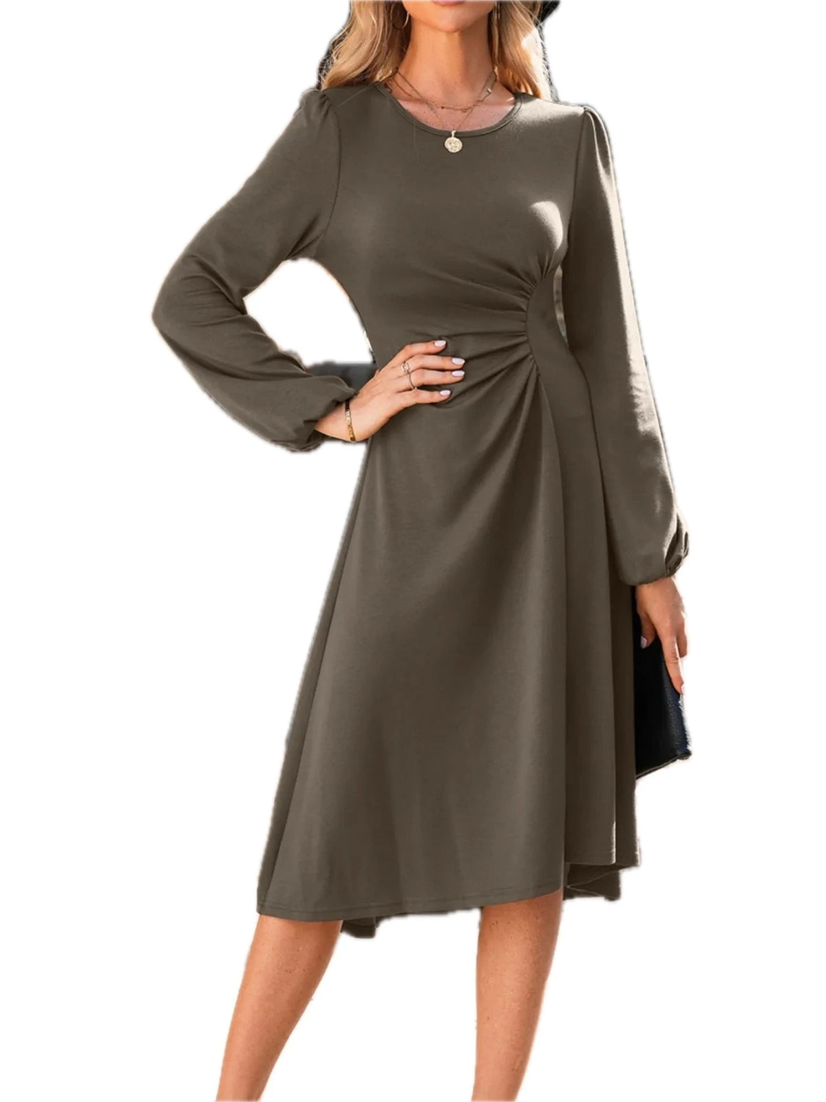 Women's Solid Color Ruched Detail Long Sleeve Midi Dress with viscose % polyester % elastane blend for everyday wear