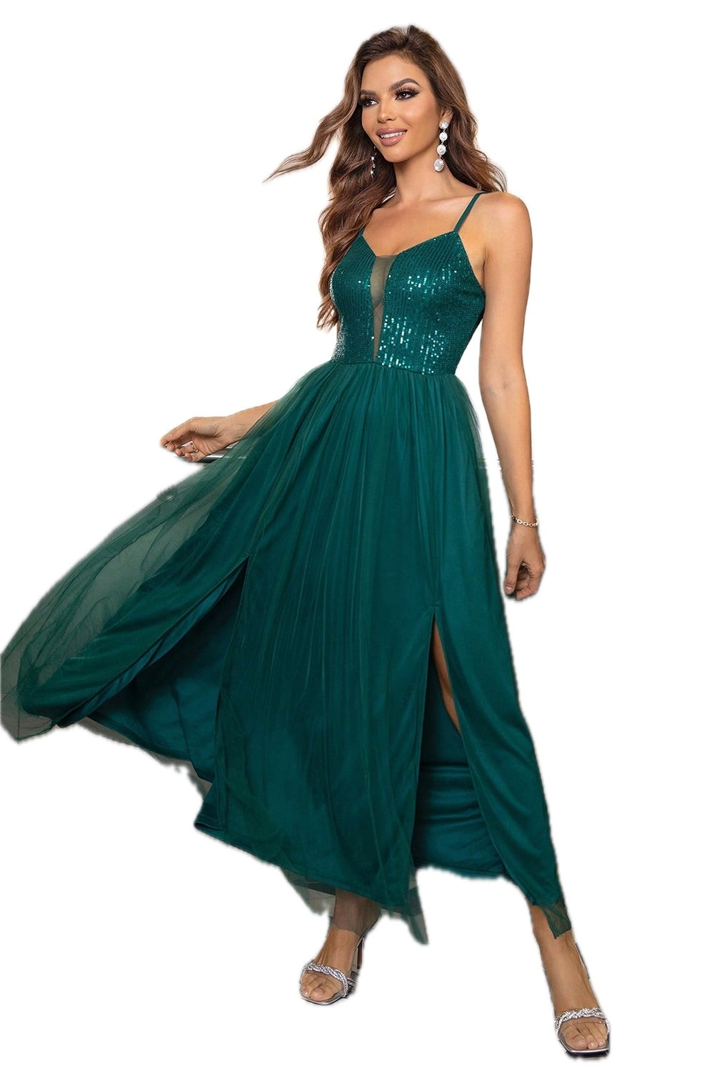 Women's Spaghetti Strap Mesh Dress with Slit and Sheer Front Not Lined 100% Polyamide Imported Elegant Party Wear