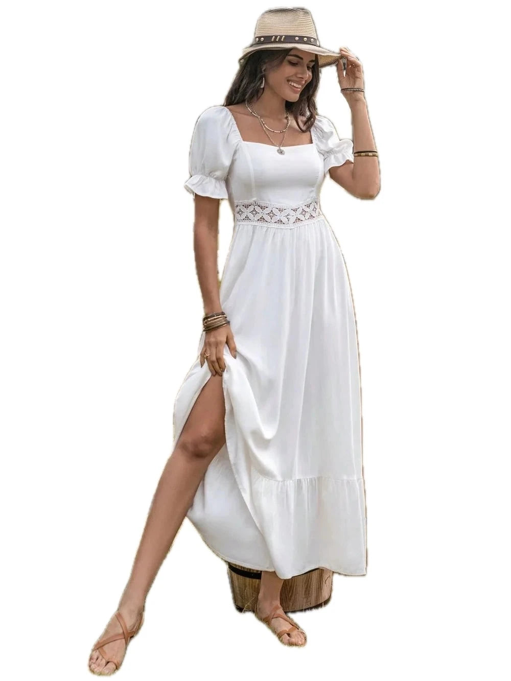 Women's Square Neck Midi Dress with Flounce Sleeves and Lace Detail Elegant Party Wear 100% Viscose Soft Drape
