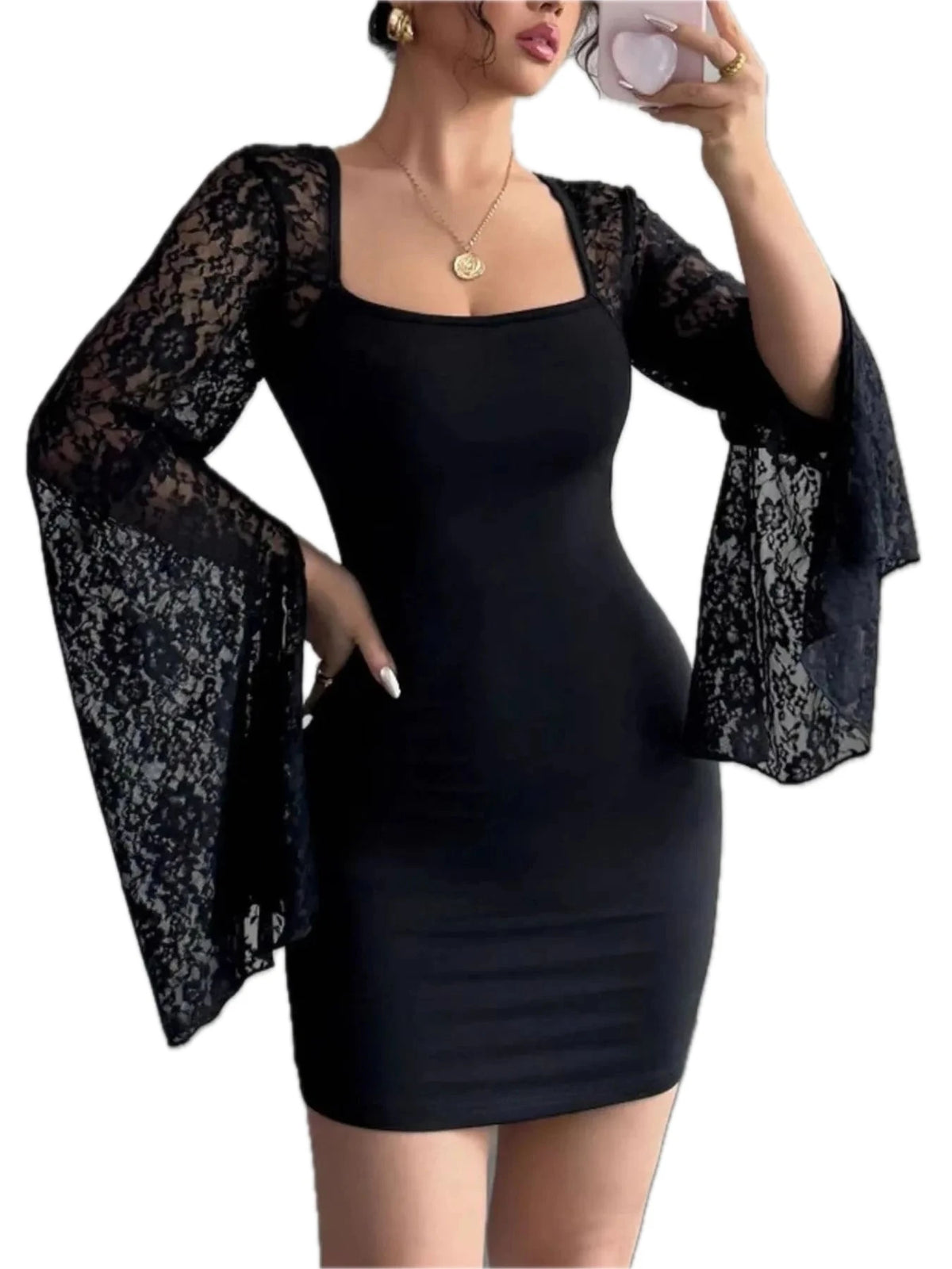 Women's Square Neck Lace Bell Sleeve Bodycon Dress with Slit Ninety Five Percent Polyester and Five Percent Spandex