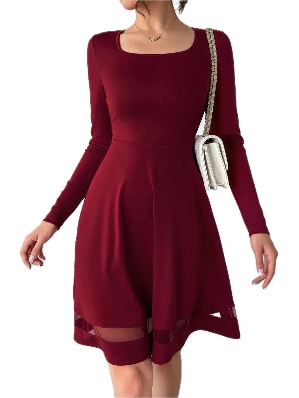 Women's square neck long sleeve mini dress with 95% polyester fabric and 5% elastane fabric for a semi sheer look
