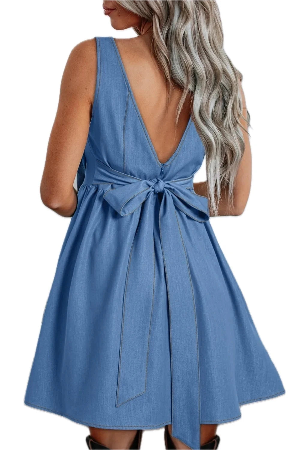 Women's Square Neck Sleeveless Mini Dress with Bow Tied Backless Front Detail 60% polyester 35% viscose 5% elastane